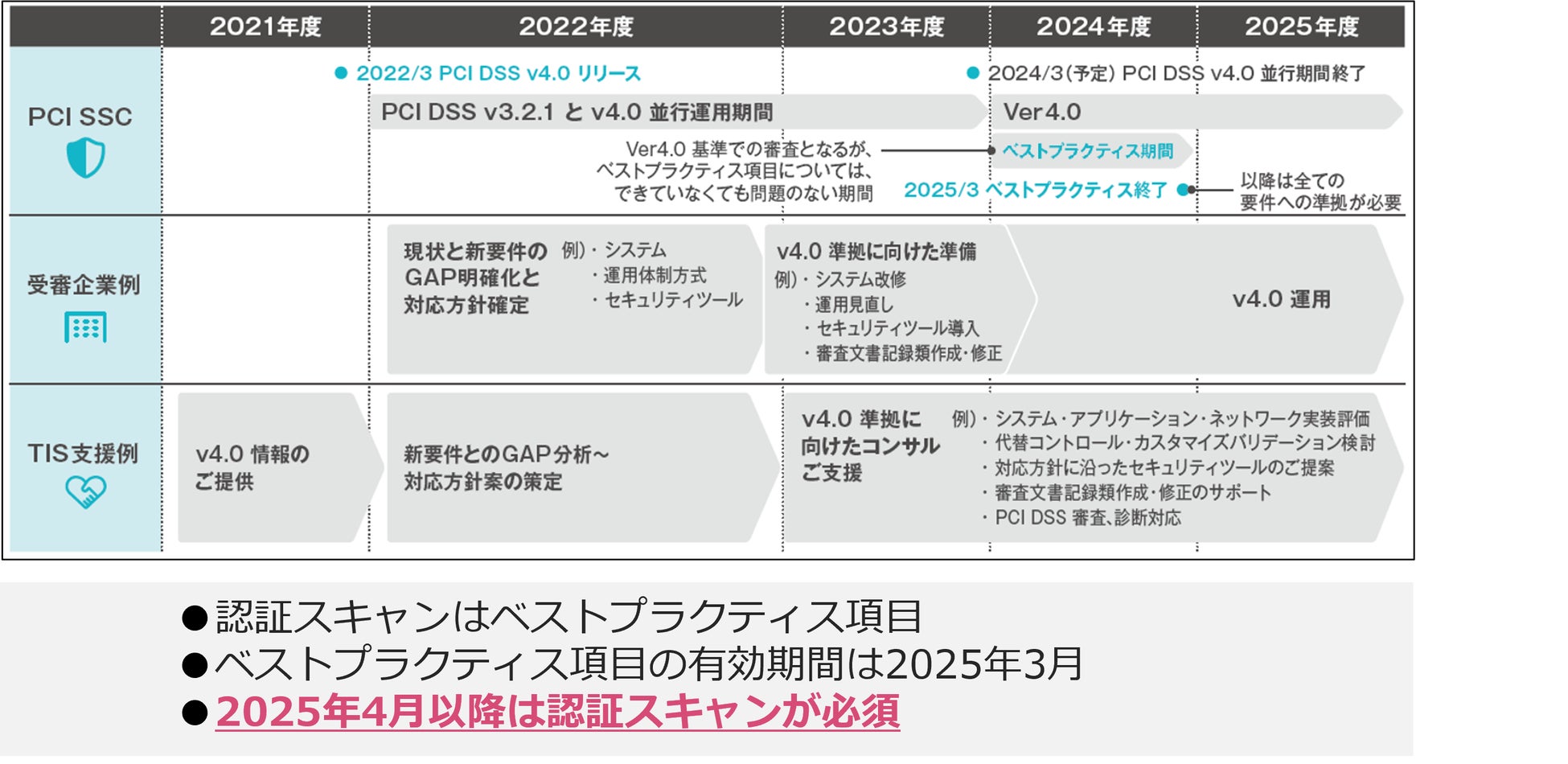ASV※2・QSA※3資格を保有し、豊富なPCI DSS準拠コンサルティングや脆弱性検査実績を持つTISが、2025年4月までの対応が必須となる認証スキャンをお客さまの導入・運用面でのハードルを最小限に抑えて本サービスを提供します。