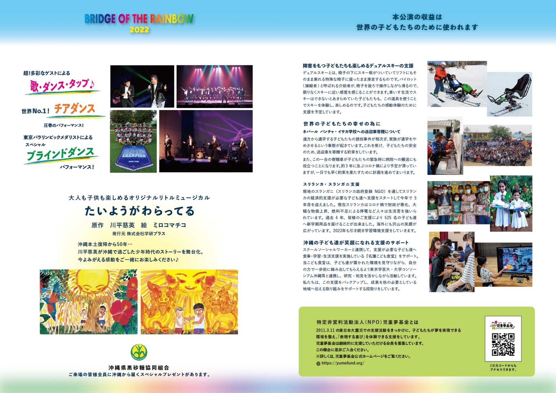 本公演の収益は「障害をもつ子どもたちも楽しめるデュアルスキー」「ネパールパンチャイサカ学校の送迎車寄贈」「スリランカ・スランガニへの学習環境」「沖縄県名護市のこども食堂」の支援に使われます。