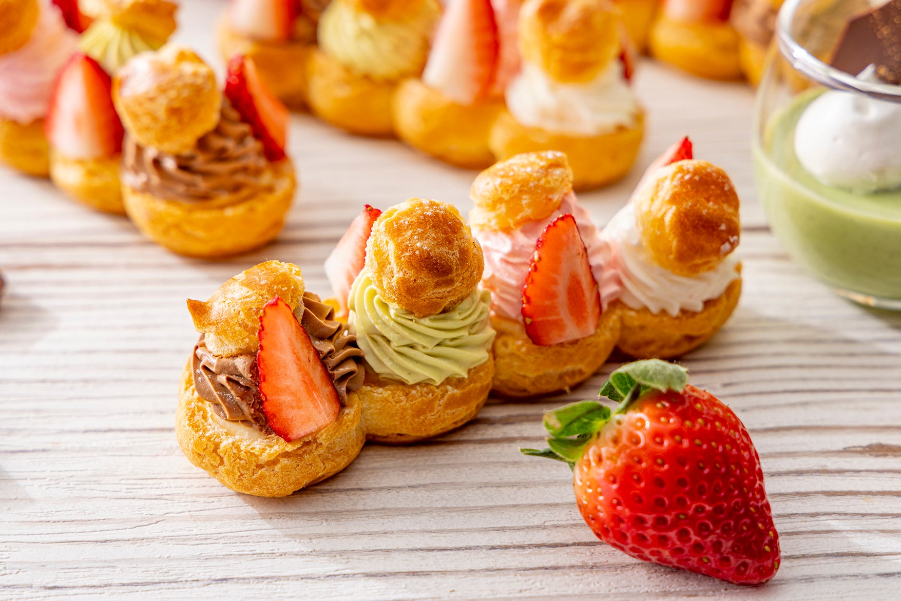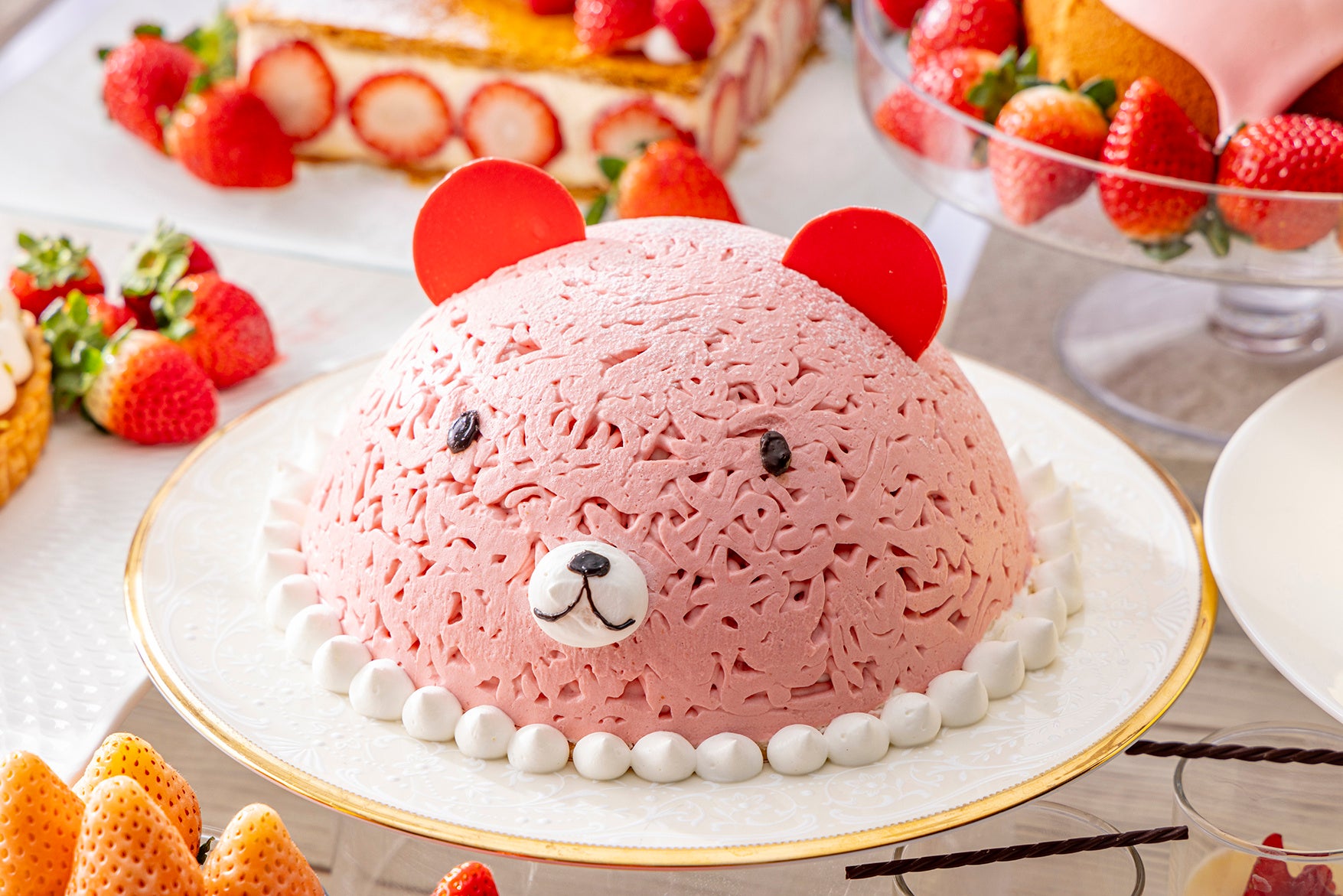 デザートエリアには、食感や味わいなどをさまざまに使い分けたいちごスイーツを多彩にラインアップしました。なかでもおすすめなのが可愛らしいくまをイメージしたピンクのモンブラン。内側にホワイトチョコレートのクリーム、いちごとベリーのジュレ、外側はいちごのレアチーズケーキで包みました。さらに4種のクリームがのったいちごのシュートレインは、サクッとしたシュー生地とピスタチオやいちごクリームなどがひとつで味わえる見た目にも楽しいスイーツです。