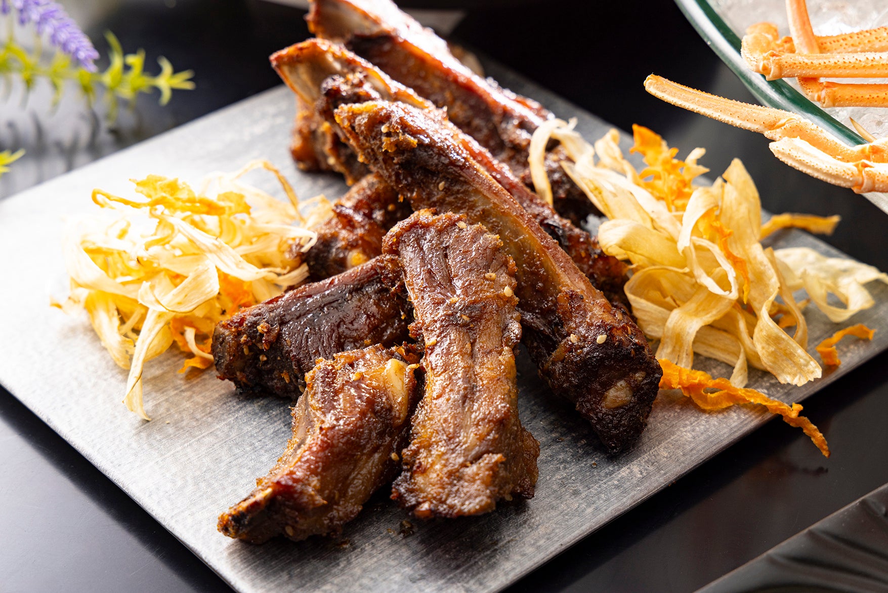 カニみそロワイヤル、蝦夷鹿のテリーヌ、はさみ漬け、地鶏のコンフィ、いかめし風サラダ、トウモロコシのガレット、ラーメンサラダ、オリエンタルライス、ポテトとじゃこのサラダ、北海道かすべのザンギ、ホッケのカルパッチョ、焼豚(ディナー限定)など
