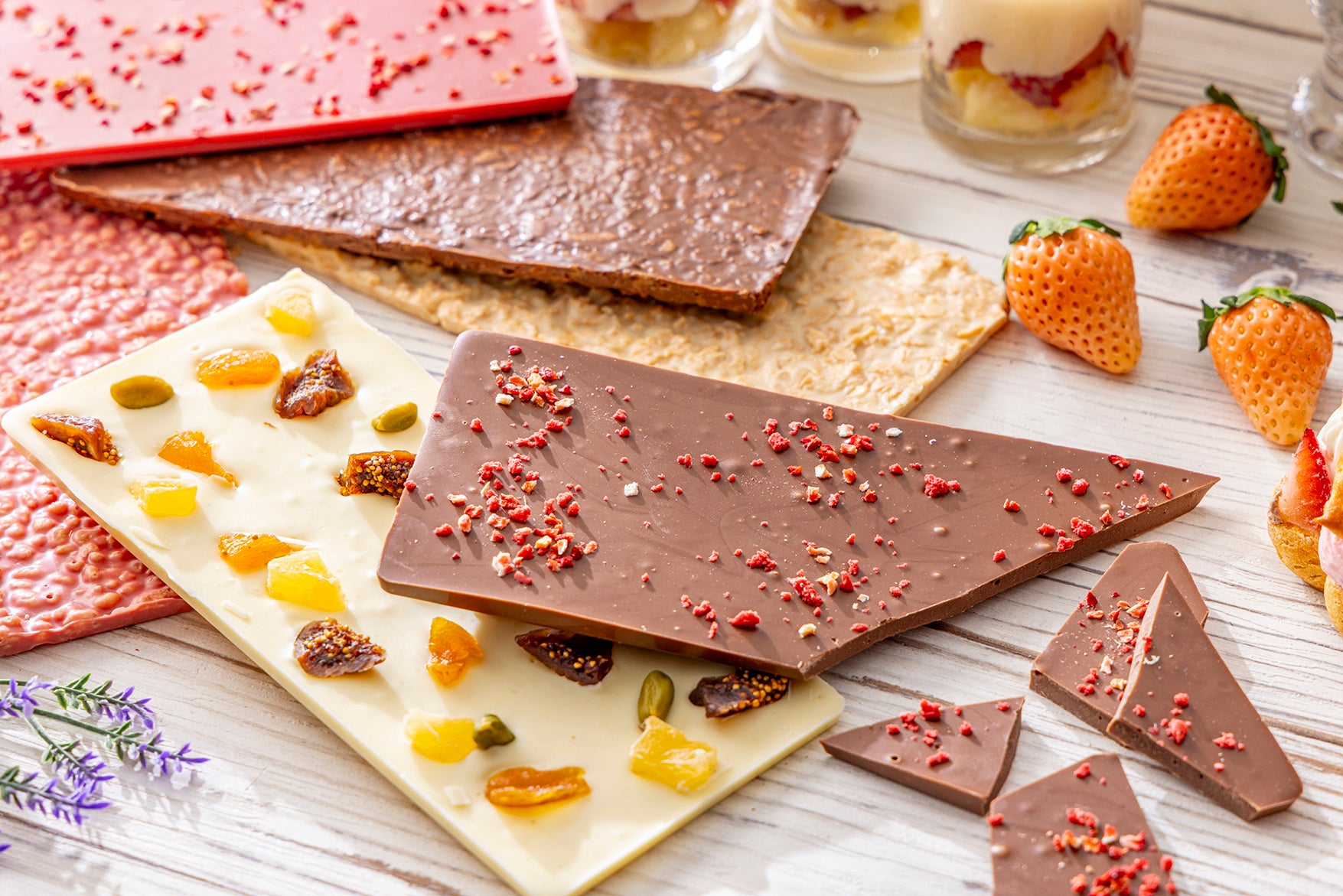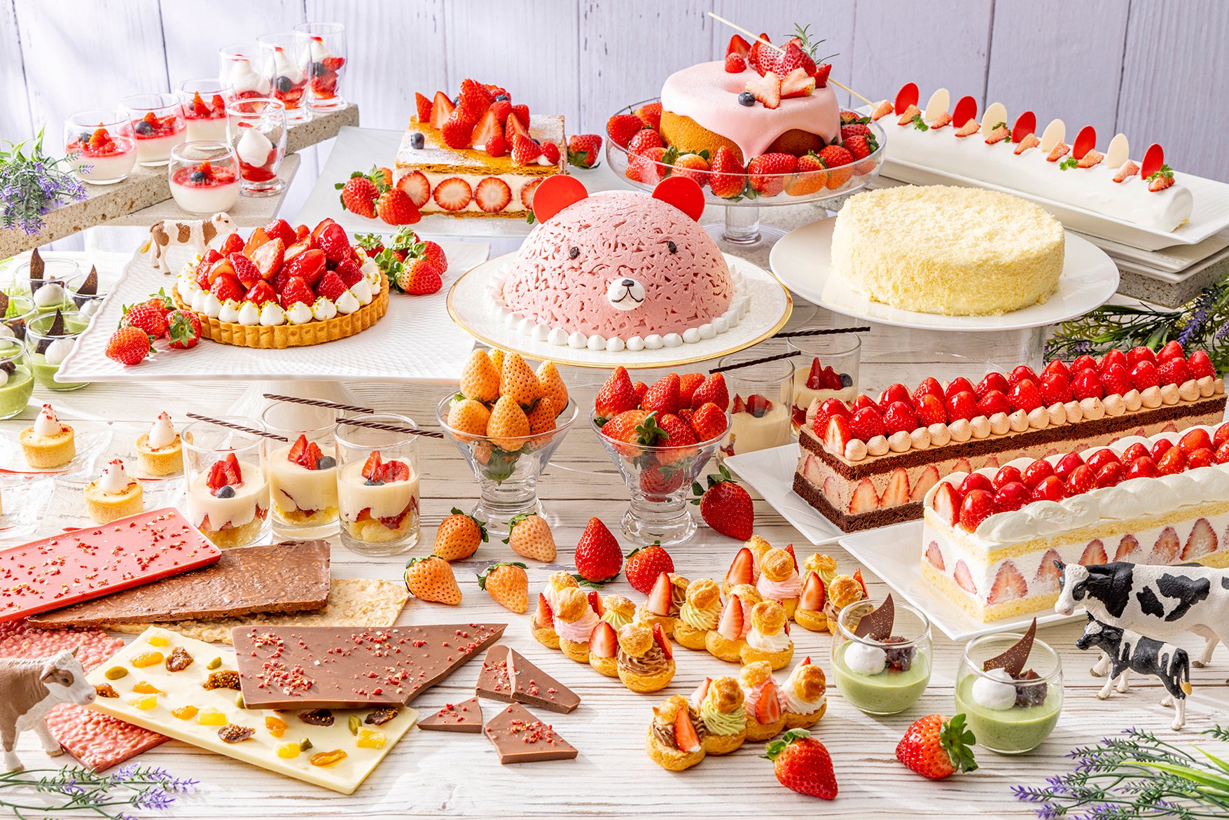 いちごのタルト、くまのいちごモンブラン、いちごのミルフィーユ、パンナコッタ、クレームダンジュ、いちごのロマノフ、いちごショートケーキ、いちごチョコレートショートケーキ、いちごのロールケーキ、4種のシュートレイン、いちごのシフォンケーキ、抹茶パンナコッタ、北海道レアチーズケーキ、北海道チーズタルト、かちわりチョコレート、ドーナッツウォール、チョコレートファウンテンなど