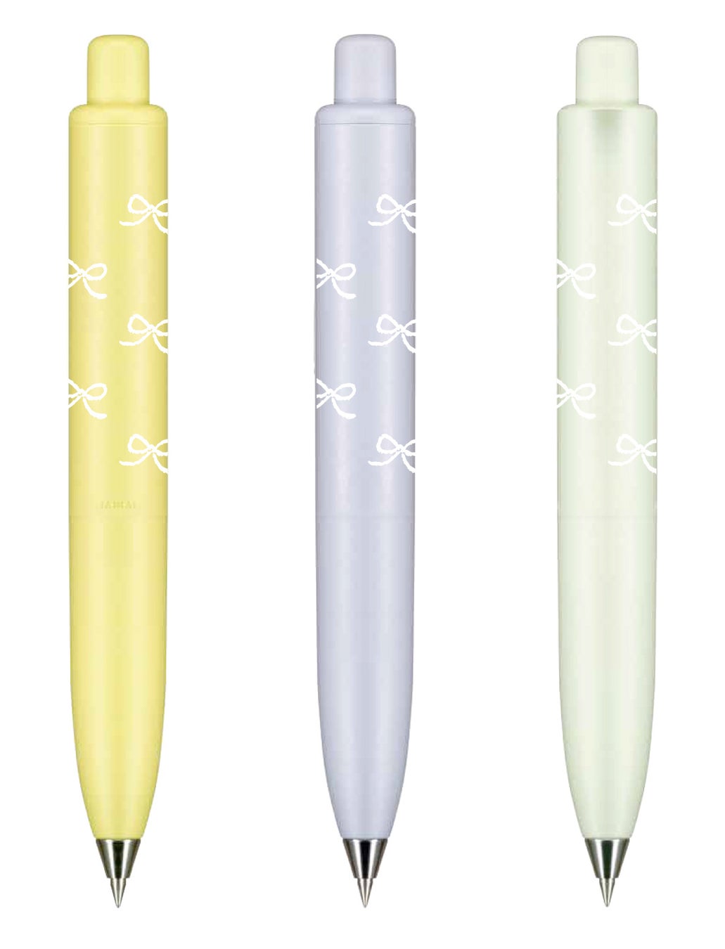 短く、手に納まるほどのサイズながら書きやすいペンシリーズに、かわいいリボン柄の限定品が登場。