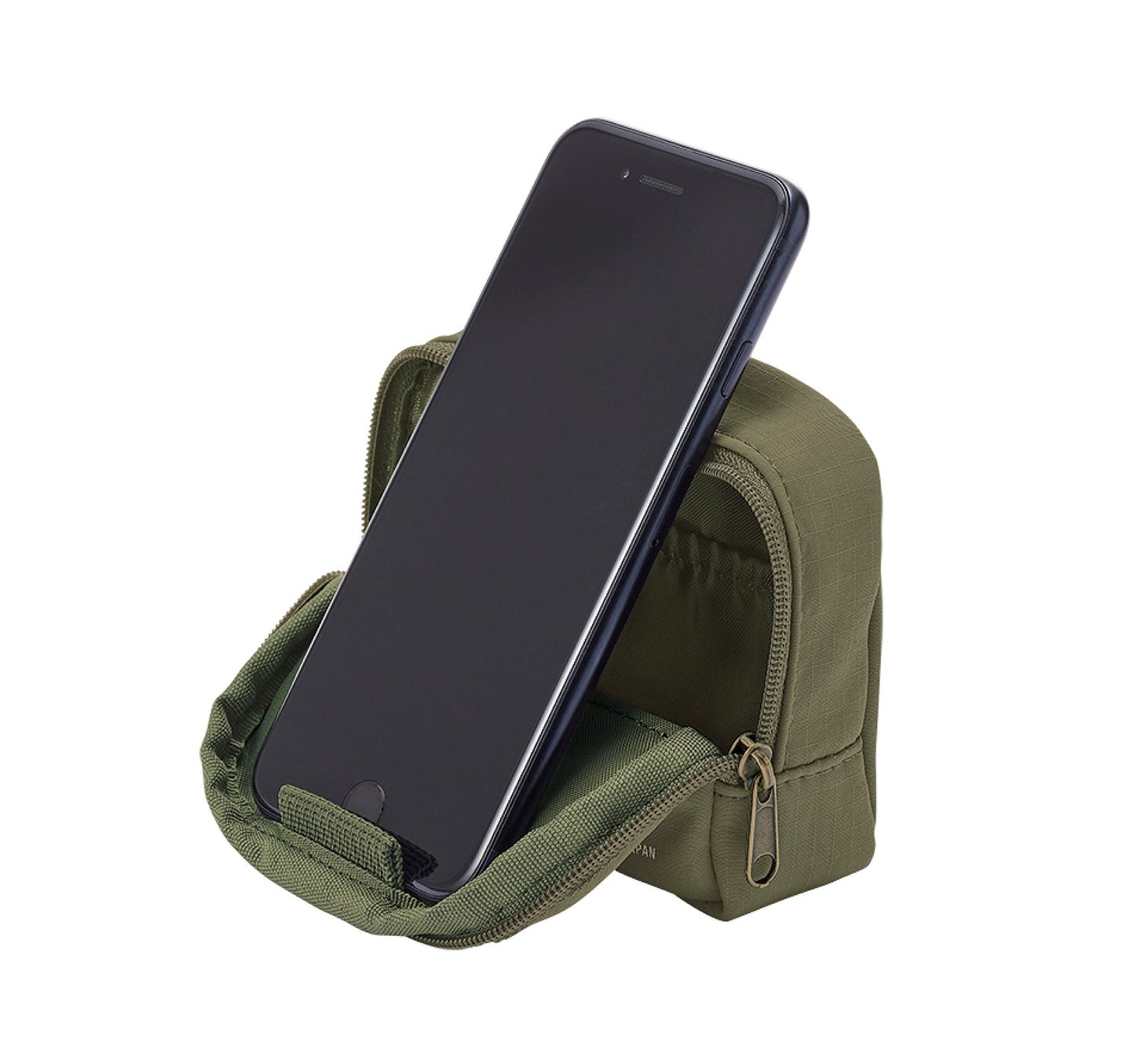 広いマチで自立して、スマートフォンスタンドにもなるポーチ。カラビナが付いているので鞄などにつけることも。