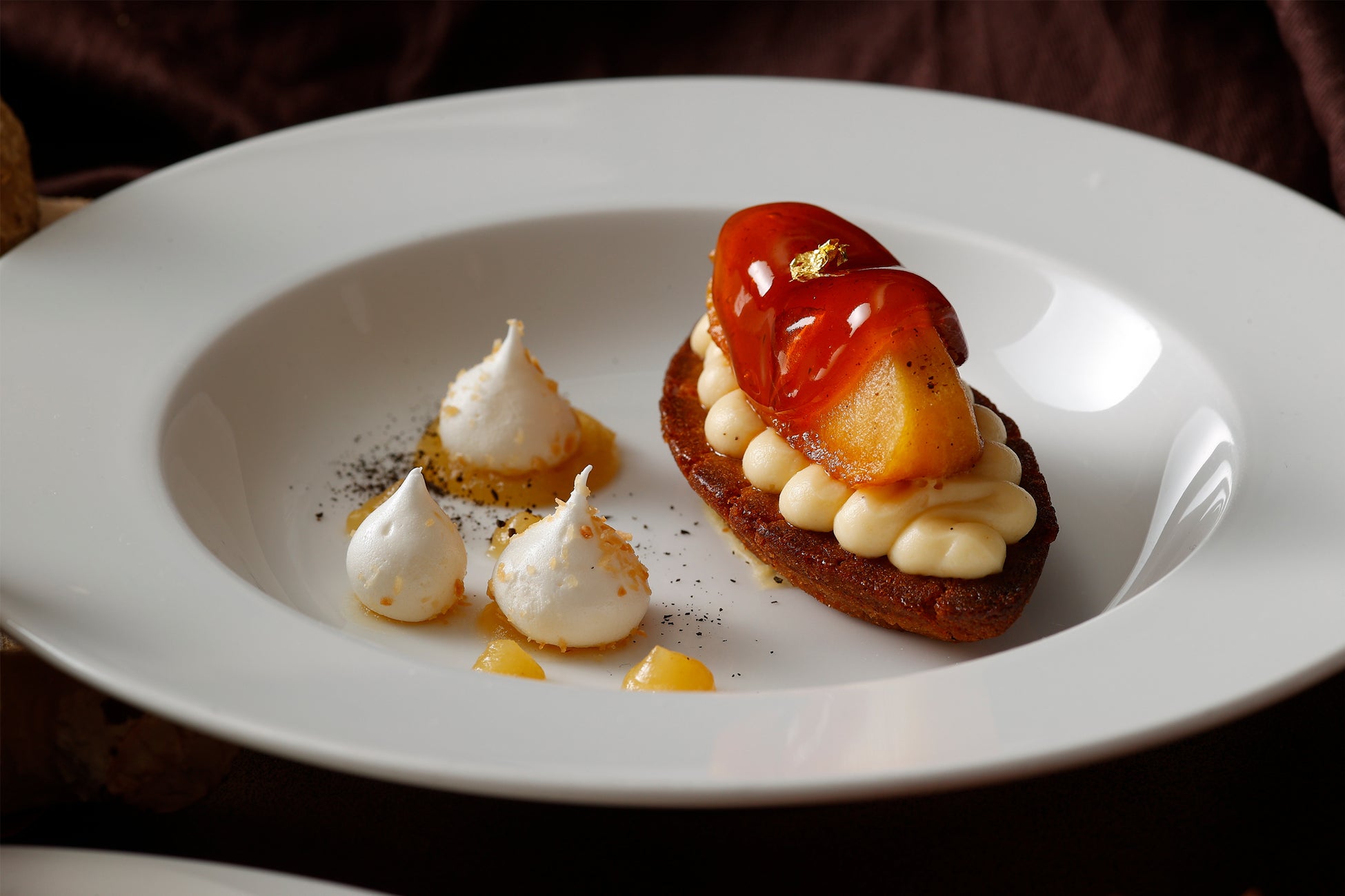 アーモンドの香ばしさとマスカルポーネ、洋梨のコンポート、紅茶のゼリーが重なりあう絶妙なハーモニーをお楽しみいただけます。