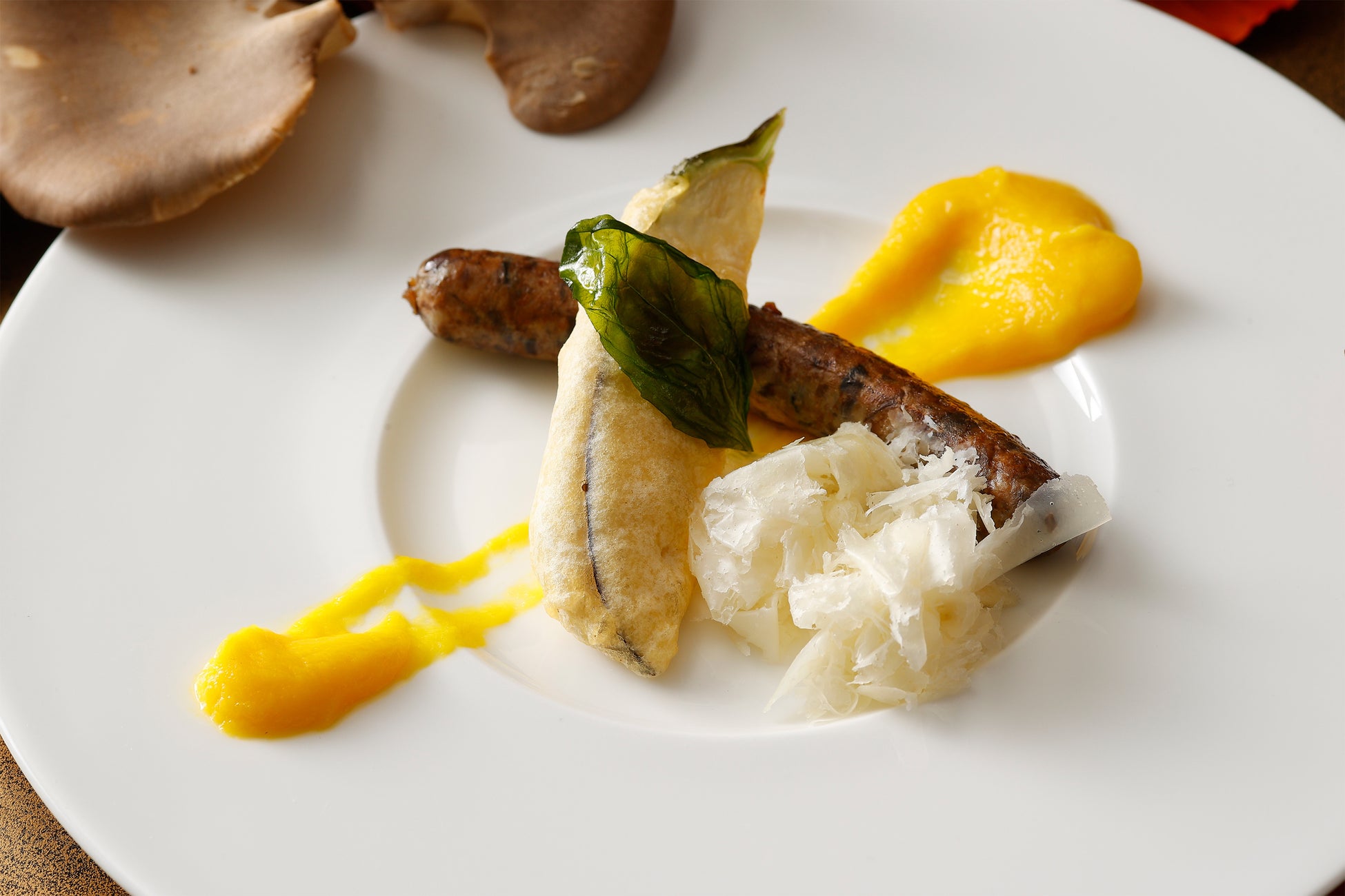 神奈川県三崎港より直送される新鮮な旬の魚を、きのこのクリームソースでお召し上がりいただけます。サクサクのグラナパダーノのチュイール風やイタリアの秋の味覚に欠かせないポルチーニ茸を飾りました。