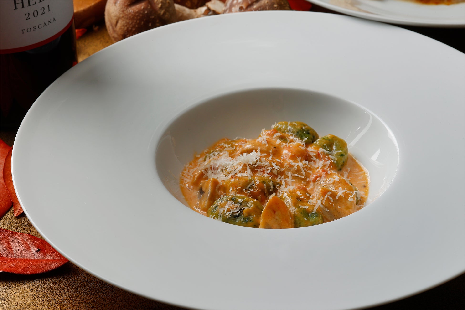 前菜は、きのこ入りサルシッチャに希少なロディジャーノチーズを添え、パスタは芳醇なフォンティーナチーズを合わせたニョッキや、目の前でトリュフを削る「トリュフのタリアテッレ」をご用意しました。魚料理には三崎港直送の新鮮な白身魚を香り豊かなきのこのクリームソースときのこの王様と称されるポルチーニ茸とともにお召し上がりいただきます。肉料理には、ボローニャを代表する郷土料理のカツレツを、風味豊かでクリーミーなチーズソースでお楽しみいただけます。美食の秋、旬のきのこと個性豊かなそれぞれのチーズの味わいをご堪能いただける秋限定のディナーコースです。秋のイタリアを旅するように過ごすお食事のひとときを、この機会にいかがでしょうか。
