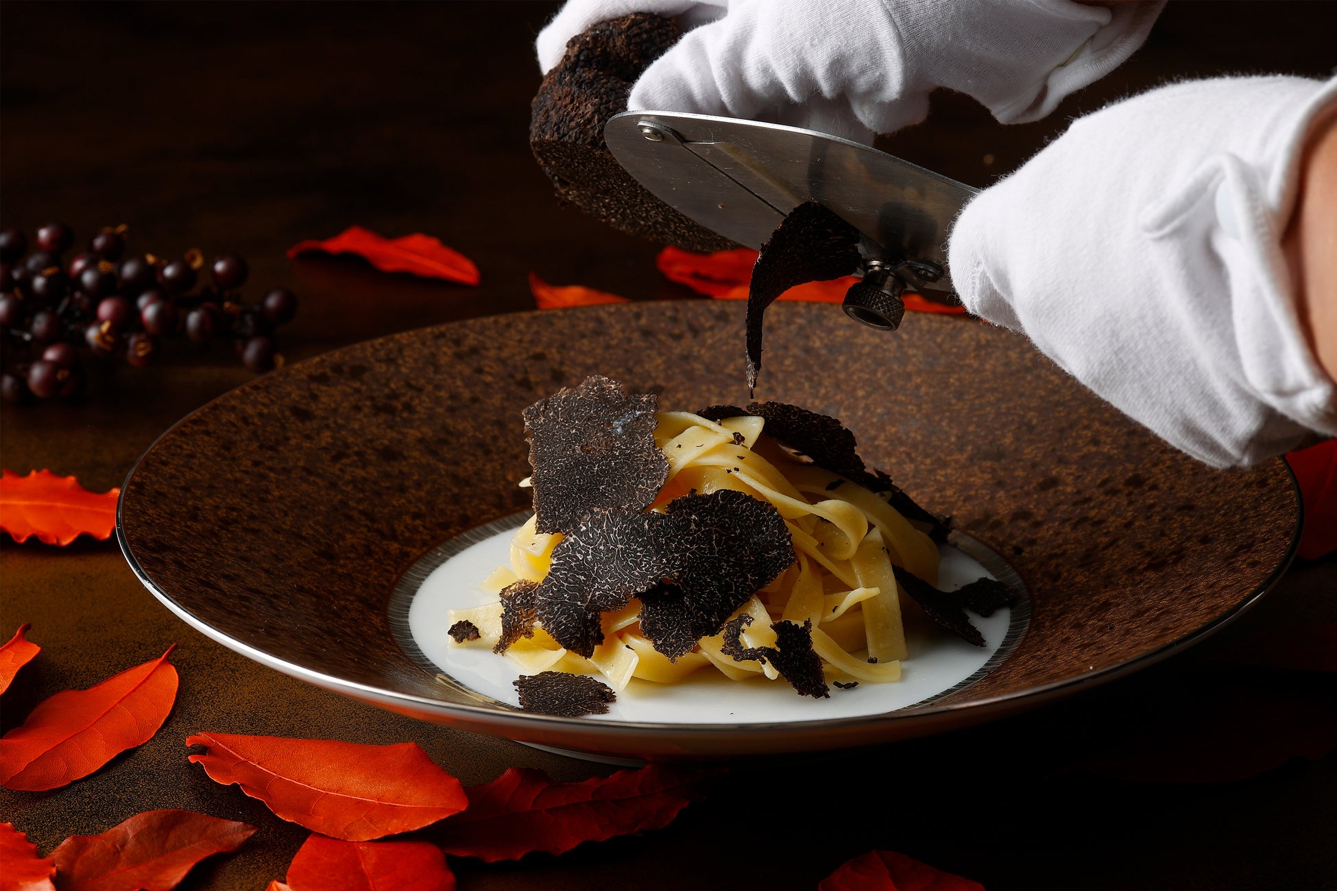 お客様の目の前でトリュフを削るパフォーマンスとともに、その芳醇な香りに包まれる贅沢な一皿です。