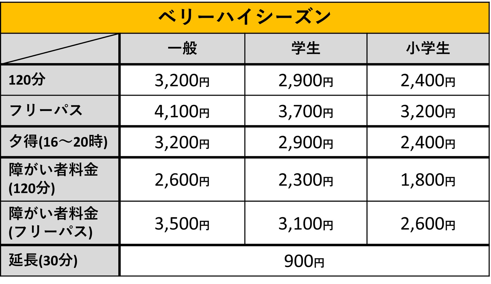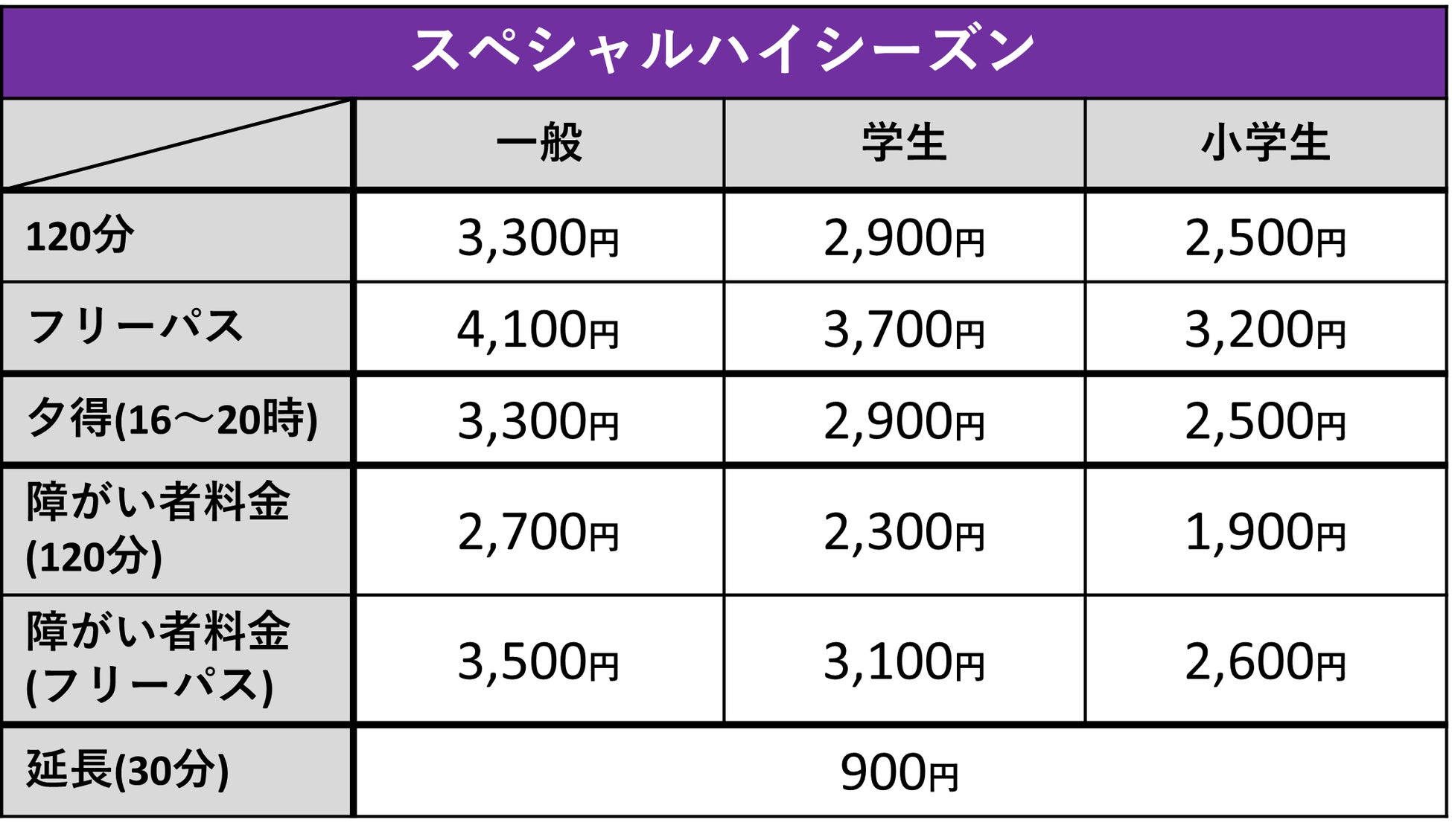 VS PARKは4種類の料金パターン(レギュラーシーズン料金・ハイシーズン料金・ベリーハイシーズン料金・スペシャルハイシーズン料金)になります。