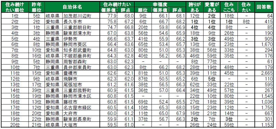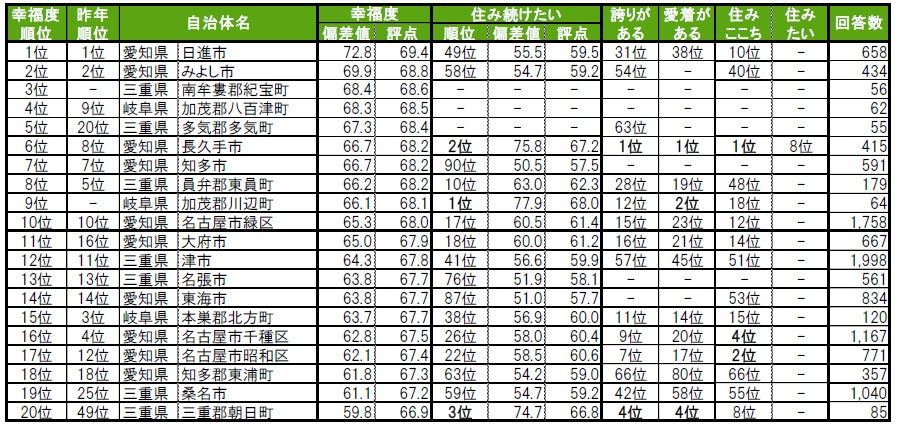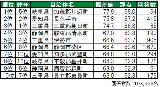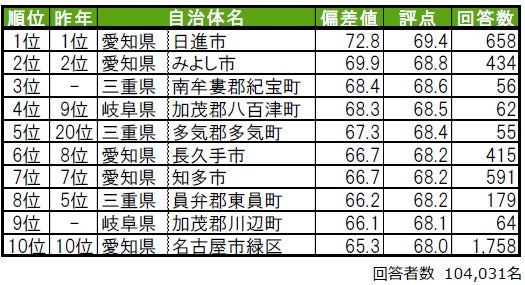 1位は2年連続で愛知県日進市で、唯一偏差値70台の高い評価を得ています。2位も、2年連続で愛知県みよし市です。3位は初登場の三重県南牟婁郡紀宝町で、昨年は累計回答者数が50名未満でランキングの集計対象外でした。その他、5位三重県多気郡多気町(たきちょう)(昨年20位)、9位岐阜県加茂郡川辺町(かわべちょう)(昨年は偏差値50未満のため順位非公開)が、昨年から順位を上げてトップ10入りしています。