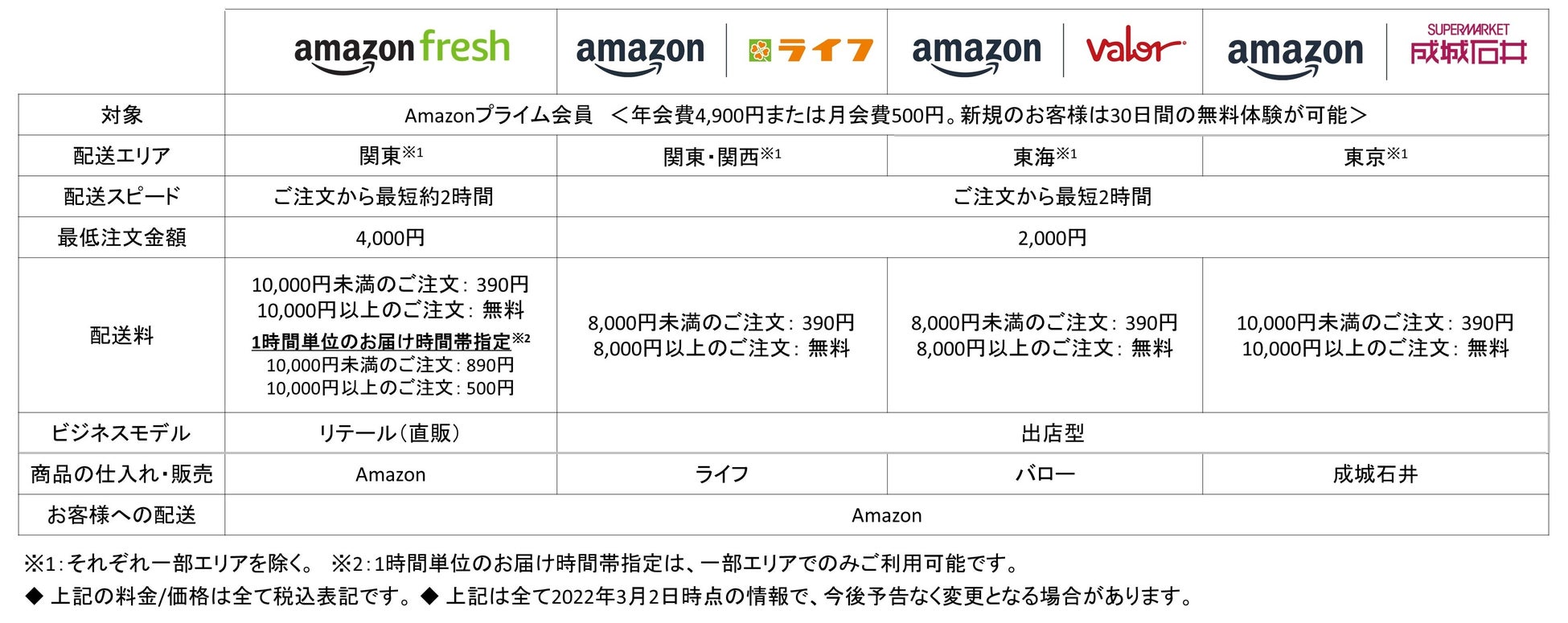 Amazonは、プライム会員向けサービスとして、東京・神奈川・千葉の一部エリアにおいて直営ネットスーパーの「Amazonフレッシュ」( http://www.amazon.co.jp/fresh )を、食品スーパー ライフとの協業により、東京・神奈川・埼玉・千葉・大阪・京都・兵庫の一部エリアにおいてライフネットスーパー( http://www.amazon.co.jp/life )を、スーパーマーケット バローとの協業により、愛知の一部エリアにおいてバローネットスーパー( http://www.amazon.co.jp/valor )をAmazon上でそれぞれ展開しています。そしてこのたび、成城石井との協業により、東京の一部エリアにおいて成城石井ネットスーパー( http://www.amazon.co.jp/seijoishii )のサービスの提供を開始しました。対象エリアのプライム会員のお客様は追加の登録手続きや会費無しでAmazon.co.jp(Webサイト、Amazonショッピングアプリ)上で各ネットスーパーをご利用いただけます。