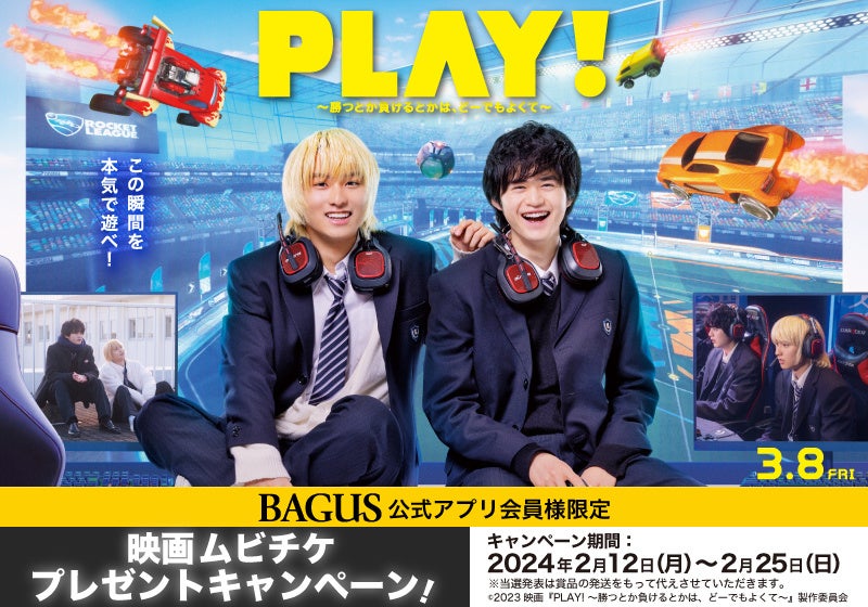 ビリヤードやダーツなどのアミューズメント施設やインターネットカフェなどを展開する「BAGUS」ブランド公式アプリ会員様を対象に、2月12日(月)から映画『PLAY! ~勝つとか負けるとかは、どーでもよくて~』公開を記念したプレゼントキャンペーンを実施します。期間中、公式アプリ内のキャンペーンバナーよりご応募いただいた会員様の中から抽選でムビチケを10組20名様にプレゼントいたします。また期間中はインターネットカフェ店舗にてポスター掲出や予告動画を放映し映画公開を盛り上げます。