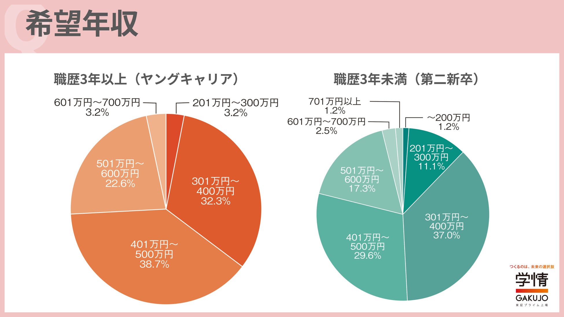 職歴ある20代転職希望者、希望年収は「401万円以上」が54.5%。ヤングキャリアは3分の2近く、第二新卒も半数占める
