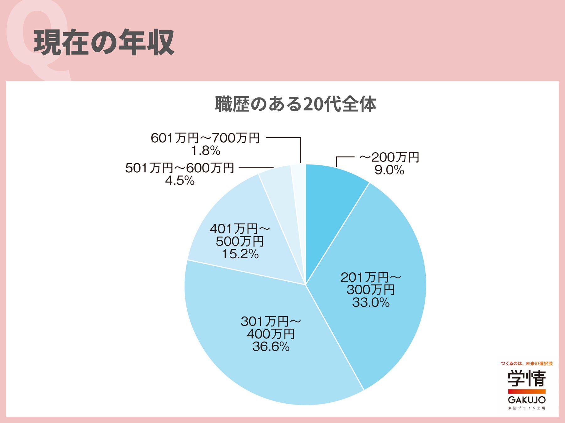 職歴のある20代の現在の年収は、「301万~400万円」が36.6%で最多。次いで「201万~300万円」33.0%、「401万~500万円」15.2%が続きました。