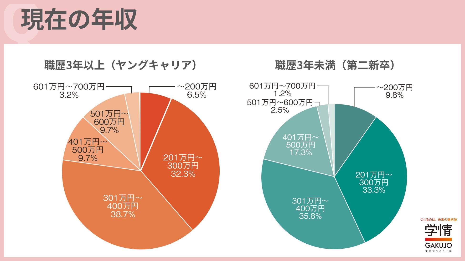 職歴3年以上のヤングキャリアと3年未満の第二新卒との比較では、ヤングキャリアの現在の年収は「301万~400万円」が38.7%で最多。次いで「201万~300万円」32.3%、「401万~500万円」と「501万~600万円」が9.7%で同率でした。第二新卒の現在の年収は「301万~400万円」が35.8%で最多。「201万~300万円」33.3%、「401万~500万円」17.3%が続きます。400万円以下の構成では、ヤングキャリアと第二新卒に大きな差はありませんでした。