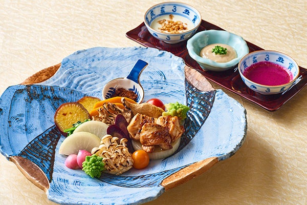 また、ヘルシーな肉質ながら、しっかりとしたコクや歯応えもある、新潟県の銘柄鶏「越の鶏」を、醤油ベースの甘辛い特製ダレで照り焼きにしてご用意いたします。照り焼きの甘みと香ばしさが絶妙に絡み合い、ジューシーで柔らかく仕上げた逸品は、“シルクスウィート”の他、旬のきのこや根菜など季節の彩り野菜の炭火焼きとも相性抜群です。
