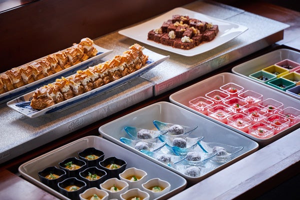 食後のデザートは、鉄板で仕上げる旬香自慢のふわふわな出来立てパンケーキをお席にご用意いたします。また、小菓子、ゼリー、焼き菓子などのパティシエ特製デザートも6種類ビュッフェ台に並びます。食べやすいサイズでお好きなだけお取りいただけますので、心ゆくまでご堪能ください!