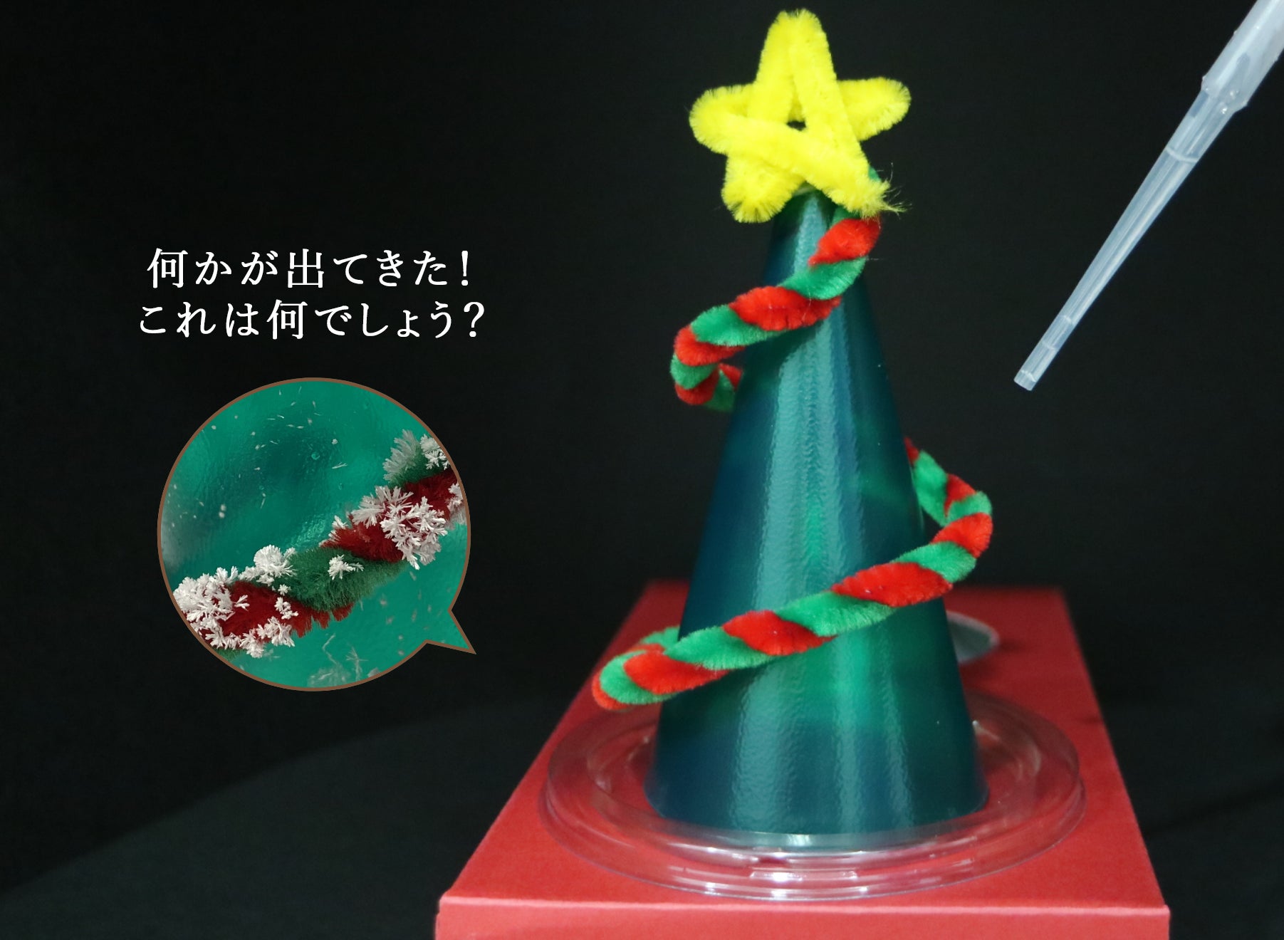今回の理科実験教室では「結晶ツリー」を作ります。尿素水を使って再結晶の実験を行い、結晶ができる仕組みについて学びます。作ったツリーは持ち帰ることができます。