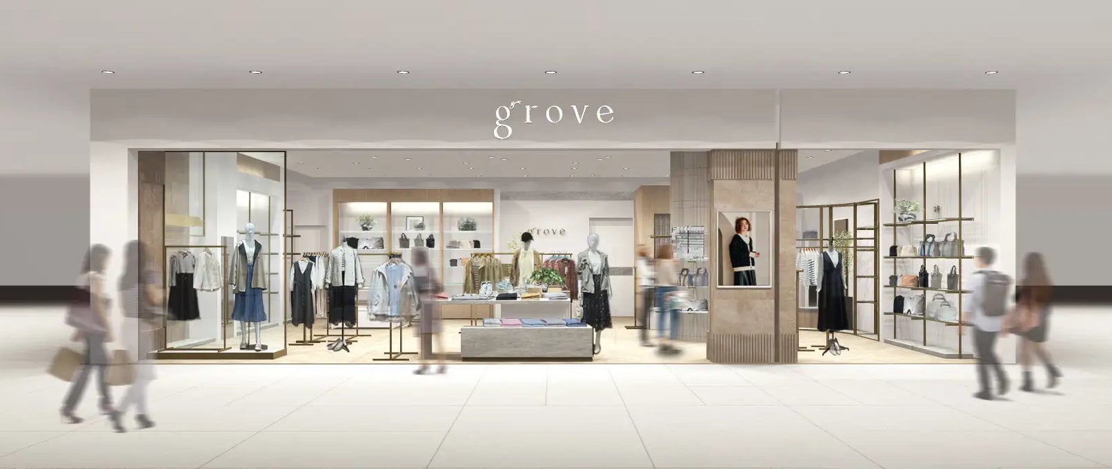 全国のショッピングセンターを中心に、オフィスシーンからデイリーまで活躍するフェミニンカジュアルを展開するブランド「grove(グローブ)」は、幅広い女性に支持される着回し力の高いトレンドアイテムを多数ご提案しております。