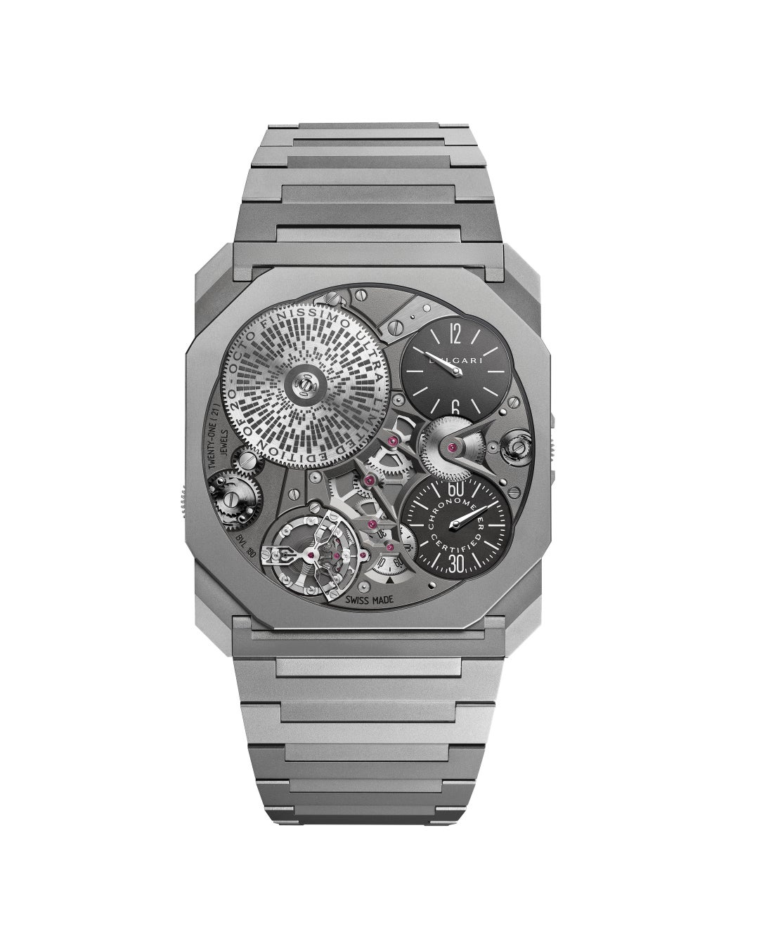 ケース/ダイヤル:径40mm、厚さ1.70mm、サンドブラスト仕上げを施したチタン製ラグとベゼルおよびミドルケース、タングステンカーバイド製メインプレート、サテン仕上げスティール製巻き上げおよび時刻設定ホイール、幾何学的装飾がエングレーブされたサンドブラスト仕上げスティール製ラチェット、グレーPVDコーティング加工サンドブラストブラス製時分レギュレーター表示カウンター、ロジウムコーティングとポリッシュ仕上げを施したブラス製の針とホワイトインデックス、ブラックインデックスインジケーター