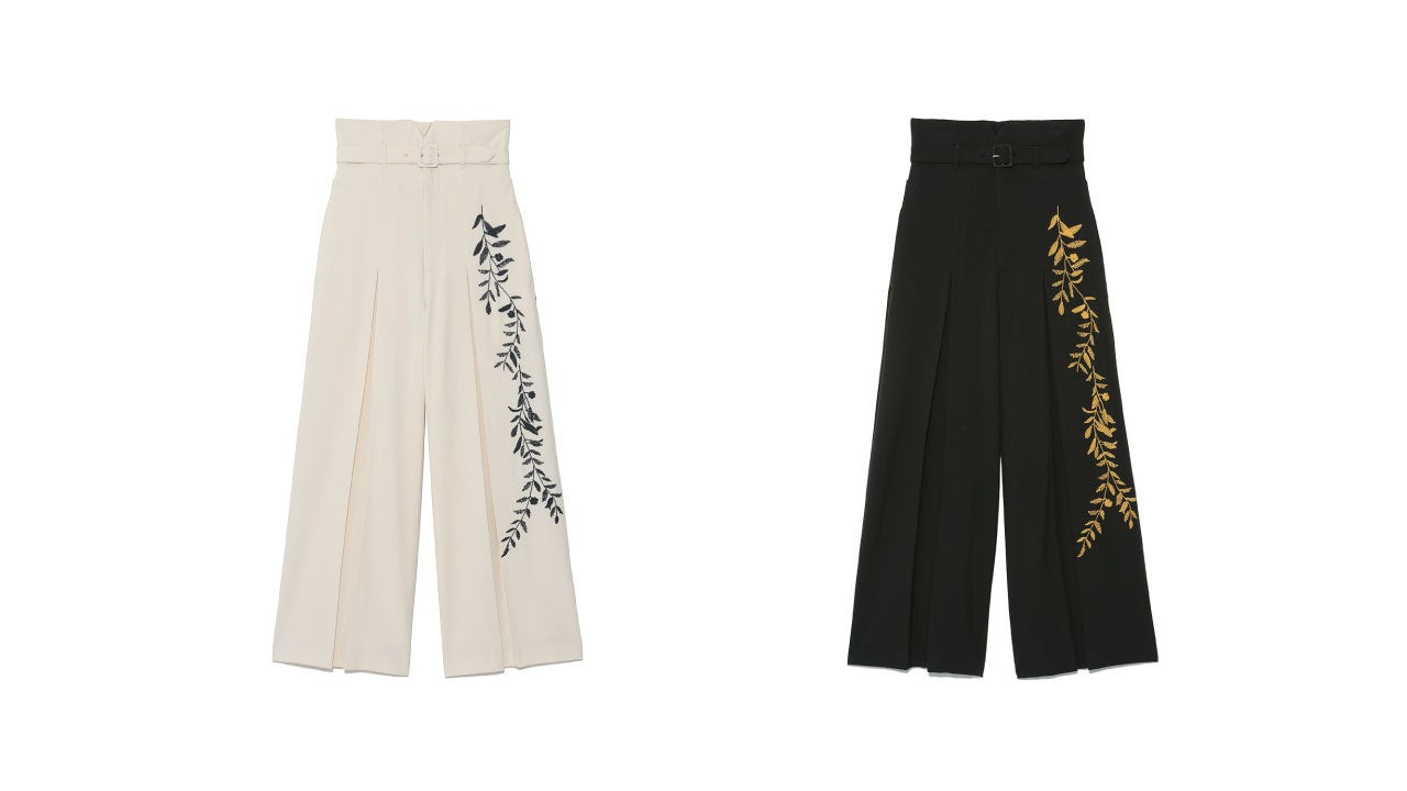 コンパクトなショート丈カーディガンと、大胆なオリジナル刺繍が目を引くハイウエストパンツのコーディネートは全身のバランスが計算されたスタイリング。カーディガンはオフショルダーで着こなせば、ヘルシーな肌見せも叶います。