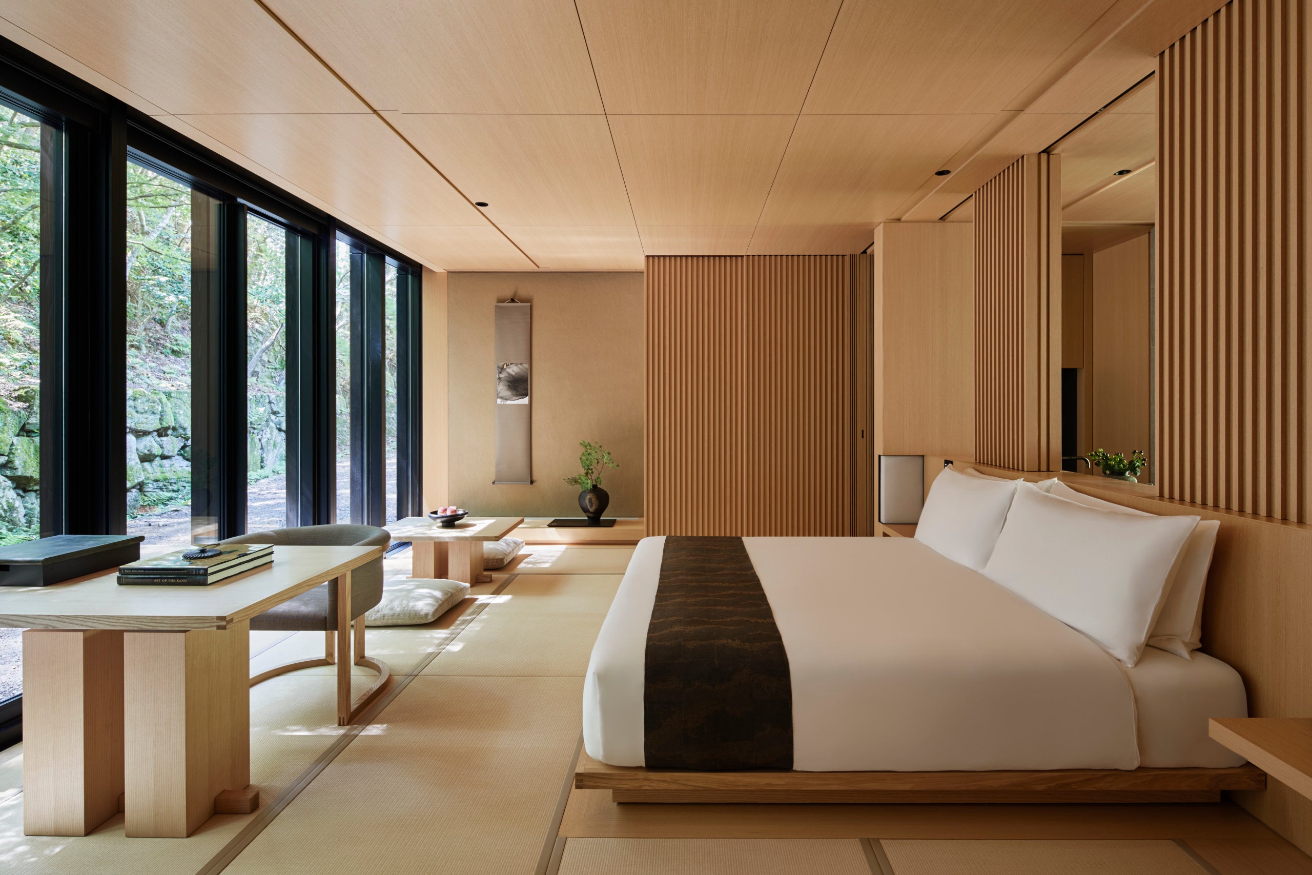 アマン京都の温泉は、露天風呂と内湯があり、疲労回復や筋肉痛の改善、また美肌効果もあると言われているアルカリ性単純泉です。ご夕食はミシュラン2つ星、金沢の料亭「銭屋」2代目主人であり、世界を舞台に活躍する総料理長高木氏による京料理『鷹庵』にてご堪能ください。(2019 年 11 月開業)
