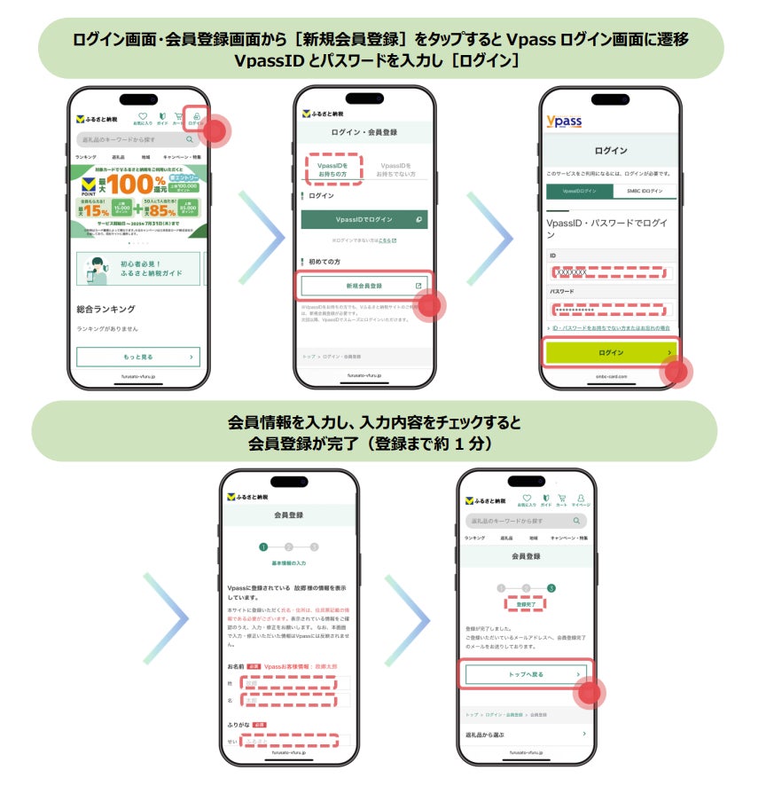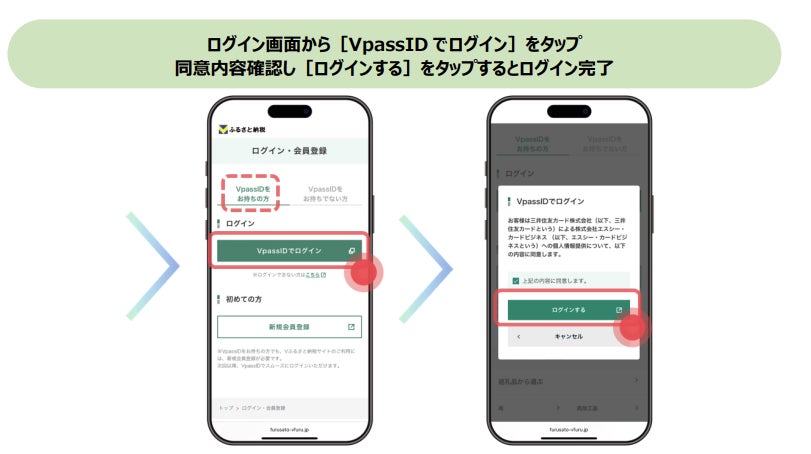 三井住友カードの会員向けサービス「Vpass」会員の方は、VpassID を用いて会員登録やログインを することが可能です。一度会員登録をしていただくと、Vpass にログインしている状態から「V ふるさ と納税」に遷移した際、ID やパスワードを入力する手間を省くことができます。2025 年内には、 Vpass 内のアイコンから「V ふるさと納税」ページに直接アクセスできるよう開発をしております。な お、VpassID をお持ちでない方も、「V ふるさと納税」をご利用いただくことは可能です。