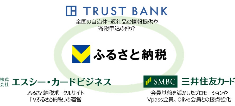 三井住友カードは会員基盤を活かしたプロモーションや Vpass 会員、Olive 会員との接点強化を担 い、エスシー・カードビジネスはポータルサイトを運営します。トラストバンクは全国の自治体・返礼 品の情報提供を通じ、寄附者体験の向上に取り組みます。