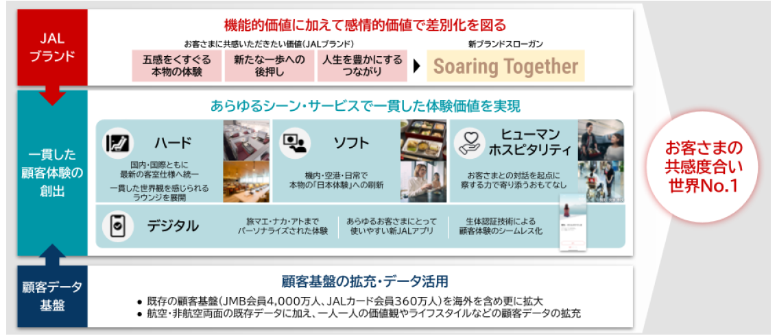 JALグループは、新ブランドスローガン「Soaring Together」*のもと、あらゆるシーンで一貫した顧客体験を創出し、JALらしいサービスを、日常・非日常のシーンでお届けしてまいります。そして、「共感」を軸とした、お客さまとの深く長い関係づくり」を推進し、「共感度世界No.1」を目指します。