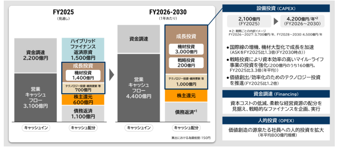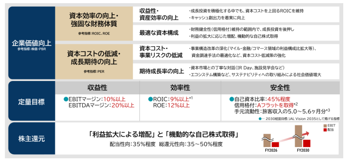 EBITマージンは10%以上、ROICは9%以上を目指すと同時に、自己資本比率は45%程度を維持し、 強固な財務体質と高い資本効率を両立します。配当性向は35%程度、総還元性向は35%から50%程度を目安とし、利益の拡大に合わせて配当も確実に増やしつつ、機動的な自己株式取得も組み合わせて株主還元を強化してまいります。また、成長分野へ大胆に資源を投入し、企業価値の持続的な向上を実現します。具体的には、国際線の機材大型化・非航空領域への投資・テクノロジー投資などを含めて年平均4,000億円規模の投資を進め、将来の成長を加速していきます。