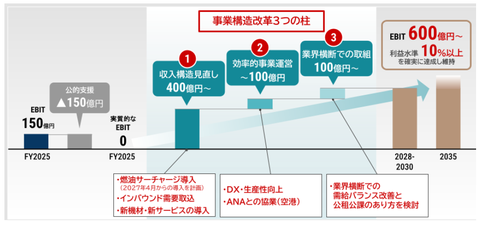 収入構造の見直しでは、燃油価格上昇に対応するため、2027年4月から国内線への燃油サーチャージ導入を検討するほか、旺盛なインバウンド需要の国内線への誘客を強化します。また、デジタル化やサービスのシンプル化に加え、既に一部の地方空港で実施している空港内特殊車両の共用化や旅客ハンドリング業務の協調など、業界協調の取り組みをさらに拡大することで、効率的な事業運営によるコスト抑制を徹底します。さらに、路線・便数の需給バランス改善に向けた検討など、業界横断での検討を加速させてまいります。