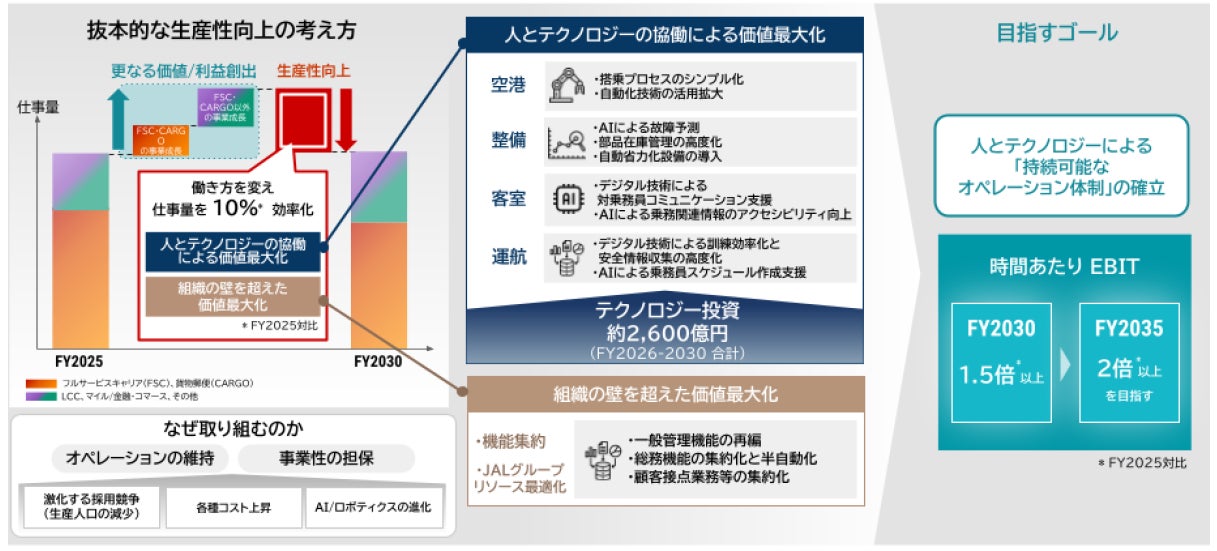 生産年齢人口の減少や構造的なコスト増加の環境下においても持続可能なオペレーション体制の確立に向け、今後5年間で約2,600億円のテクノロジー投資を実施します。AIやデジタル技術を積極的に活用し、業務の効率化と、JALグループの人財が持つ強みとデータの掛け合わせによる価値創造に取り組みます。