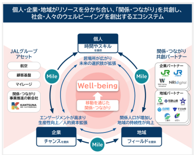 JALグループは、個人・企業・地域がそれぞれのリソースを分かち合うことで、「関係・つながり」が生まれ、社会・人々のウェルビーイングが高まっていくエコシステムを構築します。