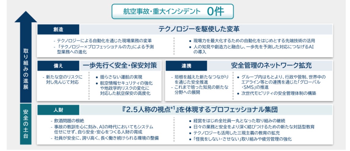 JALグループの存立基盤である「安全」を全ての活動の礎とし、先進テクノロジーとプロフェッショナリズムにより、世界最高水準の安全品質を追求し続けます。航空事故・重大インシデント「ゼロ」を継続し、変化する環境下においても揺るぎない安全を提供してまいります。