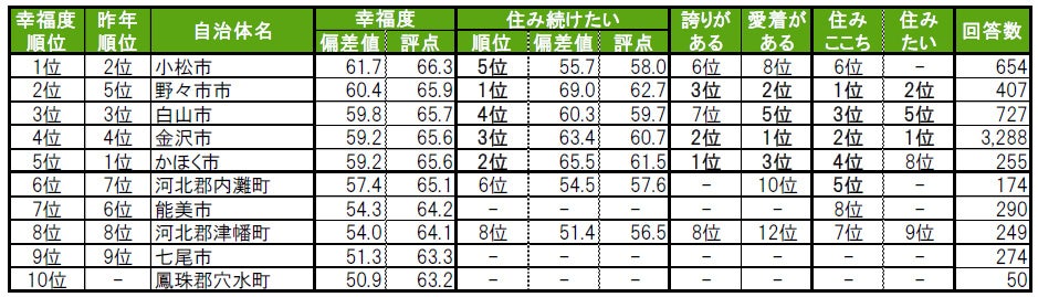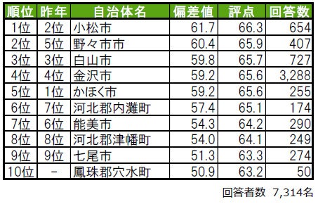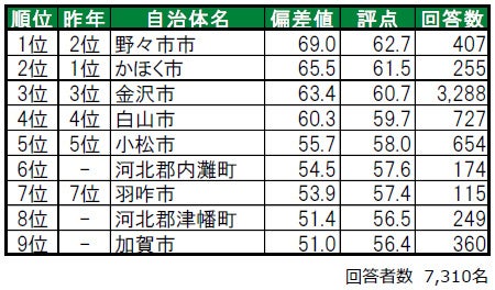 昨年2位から順位を上げた小松市が、今年は1位に輝きました。2位は、昨年5位から順位を上げた野々市市です。3位は、2年連続で白山市です。その他、今年初登場でトップ10入りしたのは、10位の鳳珠郡穴水町(ほうすぐん あなみずまち)で、昨年は累計回答者数が50名未満でランキングの集計対象外でした。