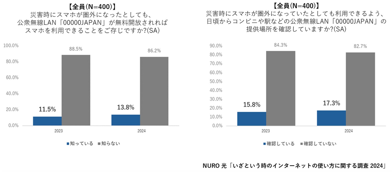 携帯キャリアが災害時に無料開放する公衆無線LANサービス「00000JAPAN」(ファイブゼロジャパン)は、スマホが圏外になったとしてもインターネットを利用することができます。公衆無線LANサービス 「00000JAPAN」を知っていると回答したのは13.8%と、昨年の調査結果(11.5%)とほぼ同水準の認知に留まりました。日頃からコンビニや駅などの公衆無線LAN「00000JAPAN」の提供場所を確認していると回答したのは17.3%となり、こちらも昨年(15.8%)と同程度の結果となりました。