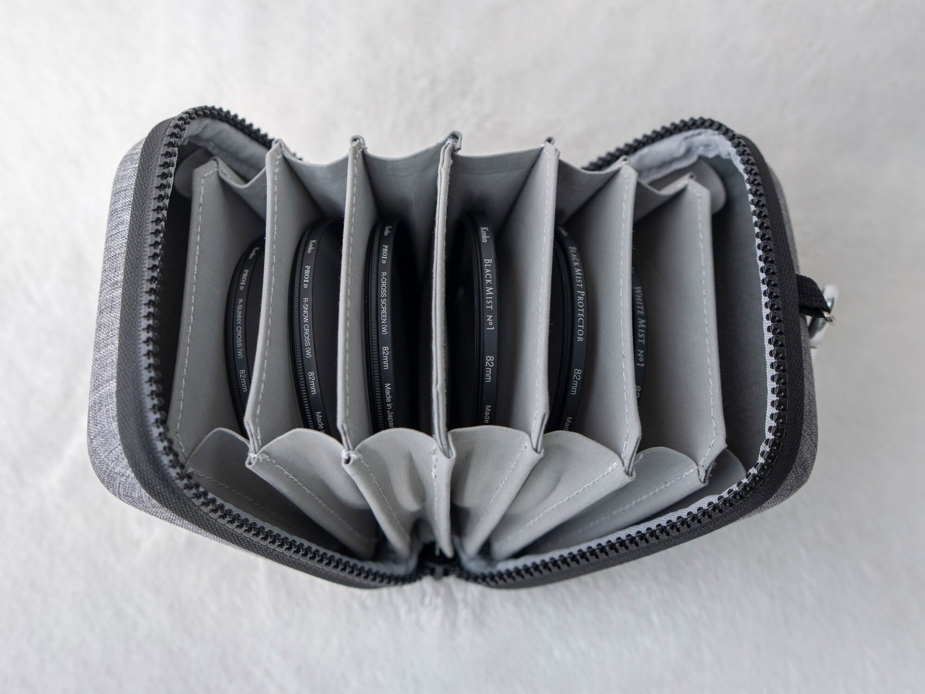 フィルター名を瞬時に視認できて、すぐに取り出せる蛇腹式を採用。82mm径フィルターが取り出しやすく、ケースを開いた時に落ちにくい、使いやすさにこだわった設計です。