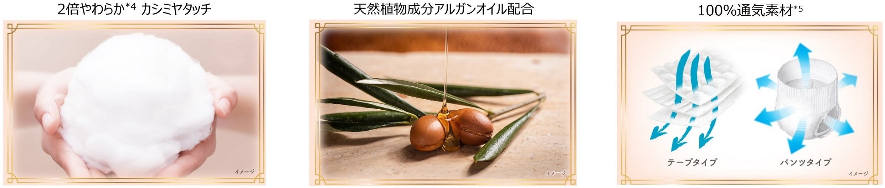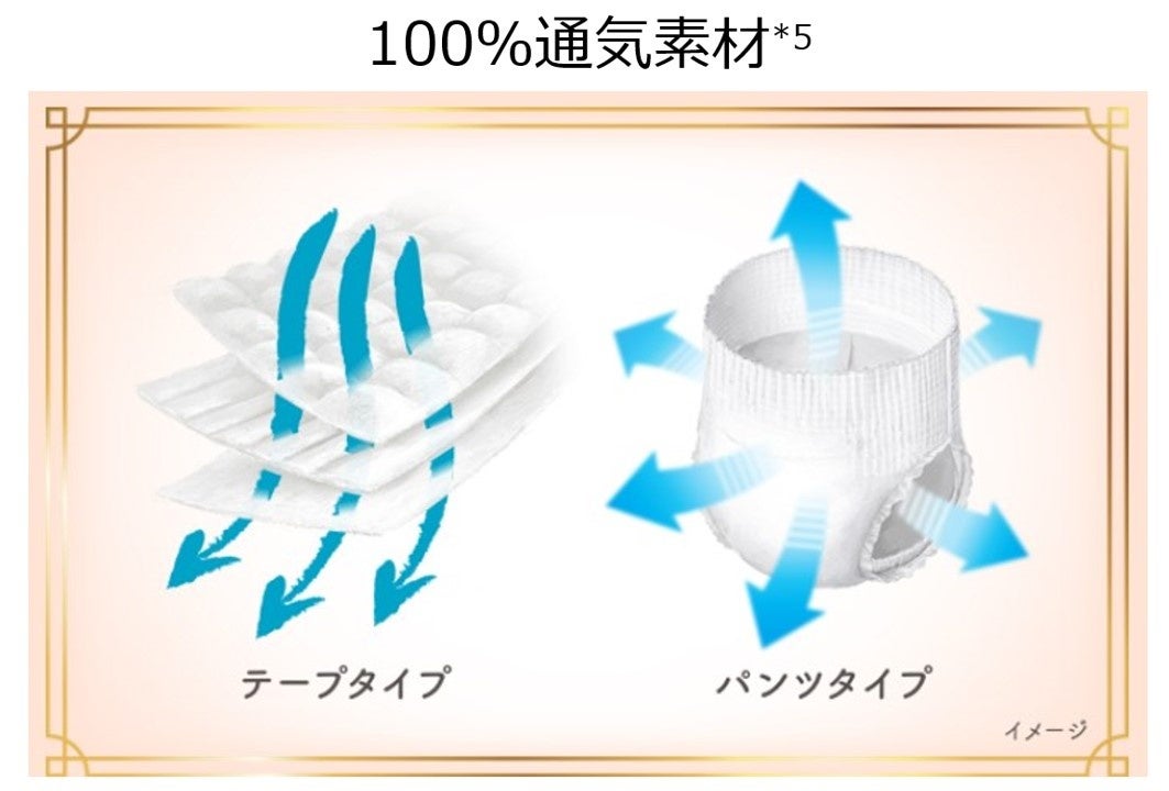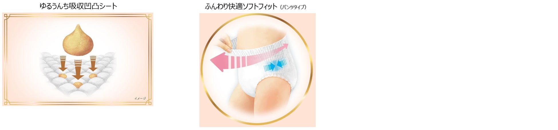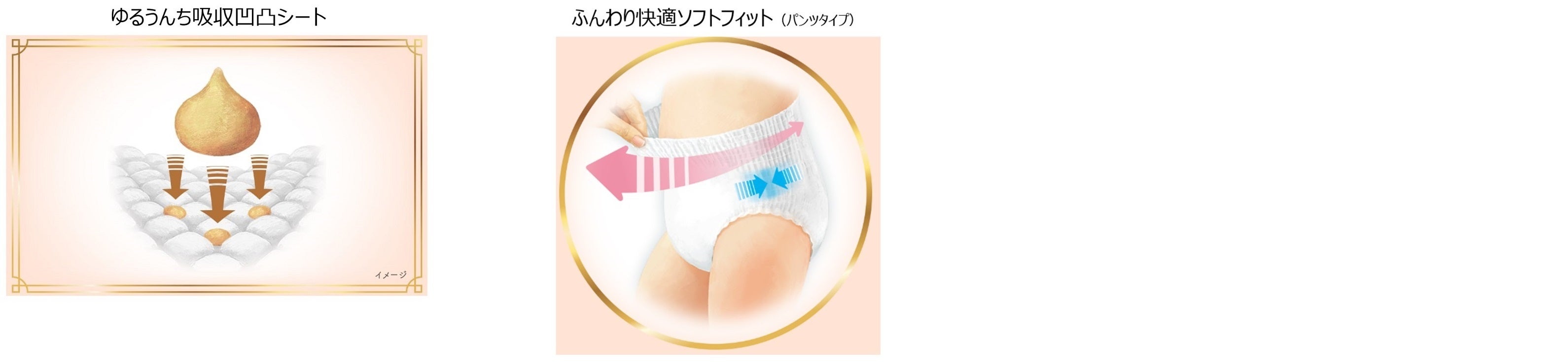 このたびの改良では、“繊細な肌に5ッ星のやさしさを*3 ”をキャッチコピーとし、赤ちゃんの繊細な肌を考えたさまざまな機能を搭載しています。上質な厳選素材で、おむつの通気性や手触り、柔軟性にこだわりました。さらに、国内唯一*1、おむつの表面シートに抗菌加工*2 を施しました。肌にふれる表面シート上で菌の増殖を抑えて、おむつの中を清潔に保ちます。