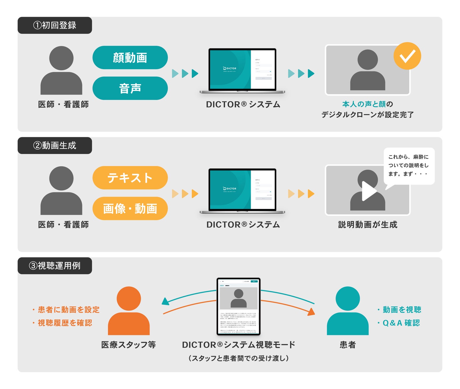 「DICTOR®」は、医師等のデジタルクローンを簡単に生成し、患者やその家族に対して医療行為等の説明を行う動画をテキストデータから自動生成し、再生をするサービスです。