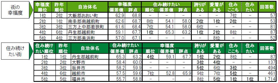 住み続けたい街のトップ3は2年連続で、1位丹生郡越前町、2位大野市、3位坂井市。