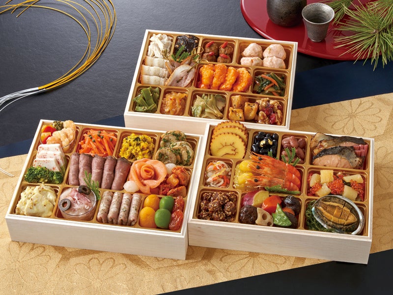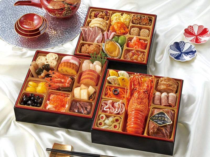 【内容】和の重のホタルイカ沖漬や白花豆、洋の重のローストビーフやロブスター、中華の重の黒糖で仕上げたローストポークやあわび煮など、「ホテルニューオータニ」王道のおせちをご堪能ください。