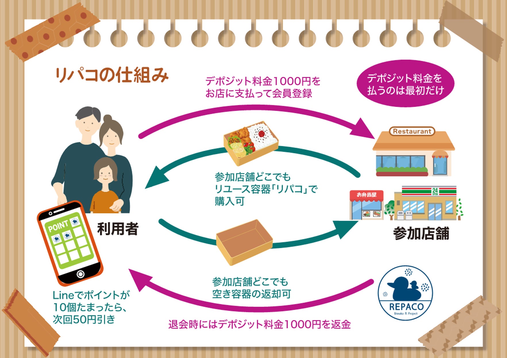 | 内容 | ・利用者はデポジット料金1000円を支払い、会員登録します。 ・会員になると、参加店舗でリパコに入ったお弁当を購入することができます。 ・食べた後の容器はどこの参加店舗に返却しても構いません。 ・利用1回毎にポイントが付与され、10ポイントで割引サービスを受けられます。 |