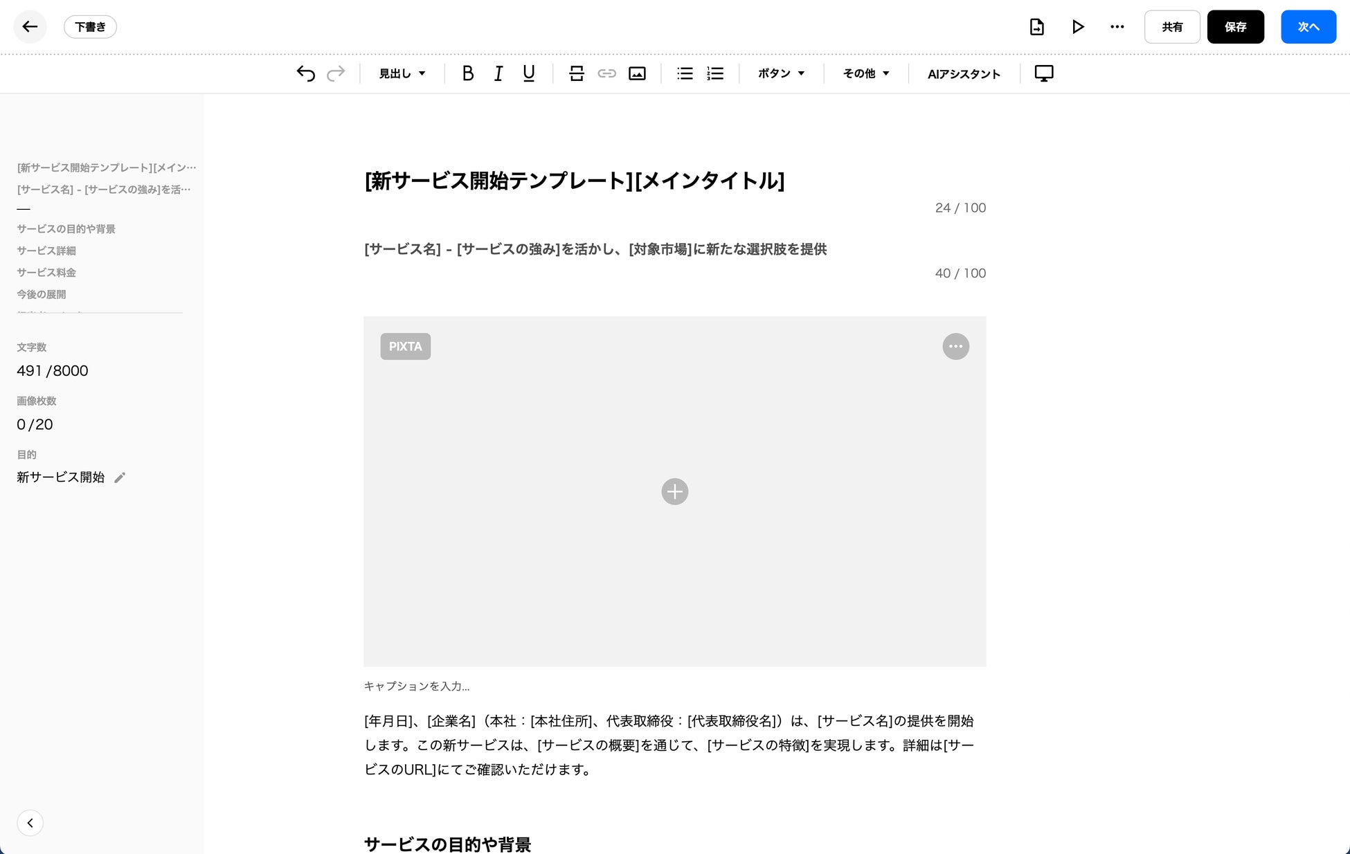 テンプレート機能は、まさに「PR Editor」に先行導入した機能で、ご利用ユーザーからも好評いただいていた機能です。慣れていない方にとってはプレスリリース作成のガイドに、熟練のPRパーソンにとってはプレスリリースに記載するポイントの整理など、様々に活用いただいています。