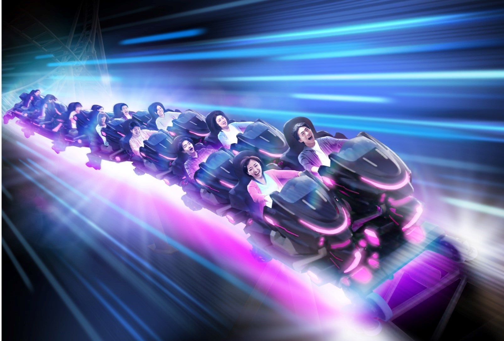 リニアランチ方式による4回の加速や、次々と訪れる“旋回”、“トンネル内の走行”、“逆走”など、胸が高鳴るようなスリリングで心地よい体験は何度も乗りたくなること間違いなしです。また、ライド本体にはLEDライトを搭載し、3編成あるグリーン、ブルー、ピンクの車両が夜になると鮮やかに光り輝きます。
