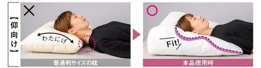 一般的な枕はわたが上にも下にも逃げることで首の下に隙間ができやすく、また横向き寝時は首が曲がったり肩を圧迫したりと、寝姿勢が崩れがち。シンクロピローは、仰向け時はわたが上下に逃げないので隙間ができず、首・肩・背中までフィット。横向き時は中わたが身体に合わせて横移動するので、心地よい高さになって寝姿勢もキープします。