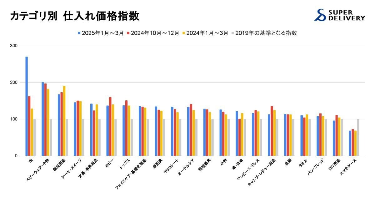 スーパーデリバリー、「2025年1月~3月 仕入れ価格動向レポート」を発表~「米」は前年比+110%の異常高騰、DIY・ホビーなどは下落傾向~