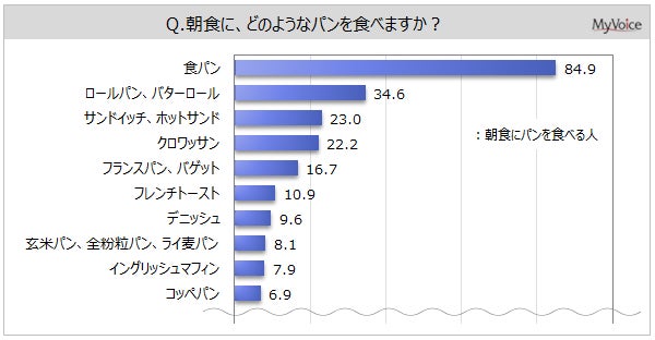 朝食に食べるパンは(複数回答)、「食パン」が朝食にパンを食べる人の84.9%となっています。「ロールパン、バターロール」が34.6%、「サンドイッチ、ホットサンド」「クロワッサン」が各2割強、「フランスパン、バゲット」が16.7%です。