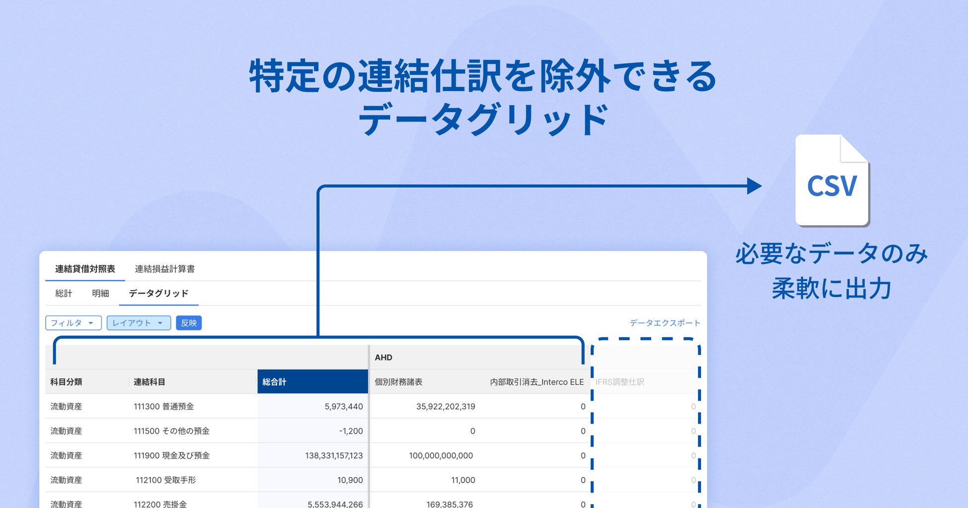 連結精算表からIFRS調整仕訳や特定の会計基準固有の仕訳を除外して出力する機能を搭載しており、日本基準・IFRSなど複数の会計基準に対応した連結データを柔軟に生成できます。これにより、監査対応や開示資料作成を効率化します。
