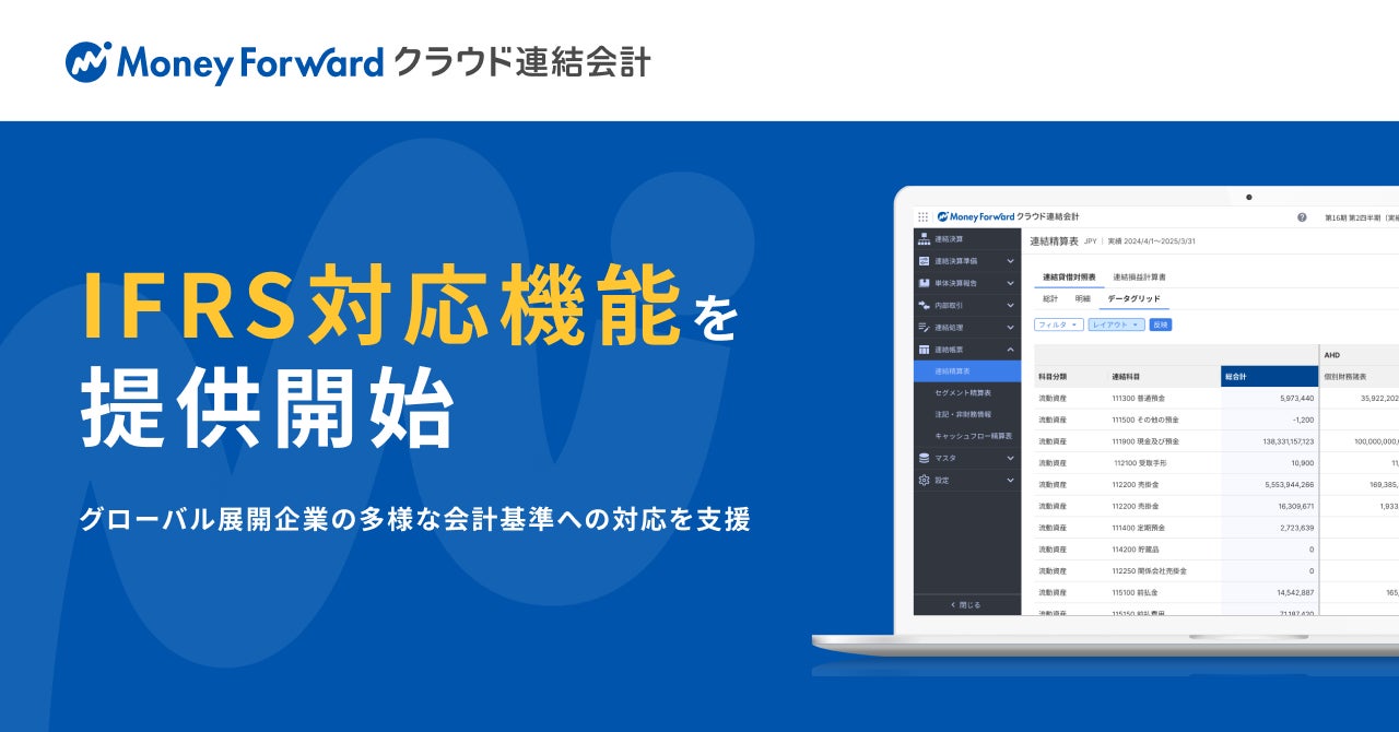 株式会社マネーフォワードは、『マネーフォワード クラウド連結会計』において、国際財務報告基準(IFRS)対応機能(以下、「IFRS対応機能」)の提供を開始しました。これにより、グローバルに展開する企業が直面する多様な会計基準への対応を支援し、連結会計処理の効率化と精度向上を実現します。