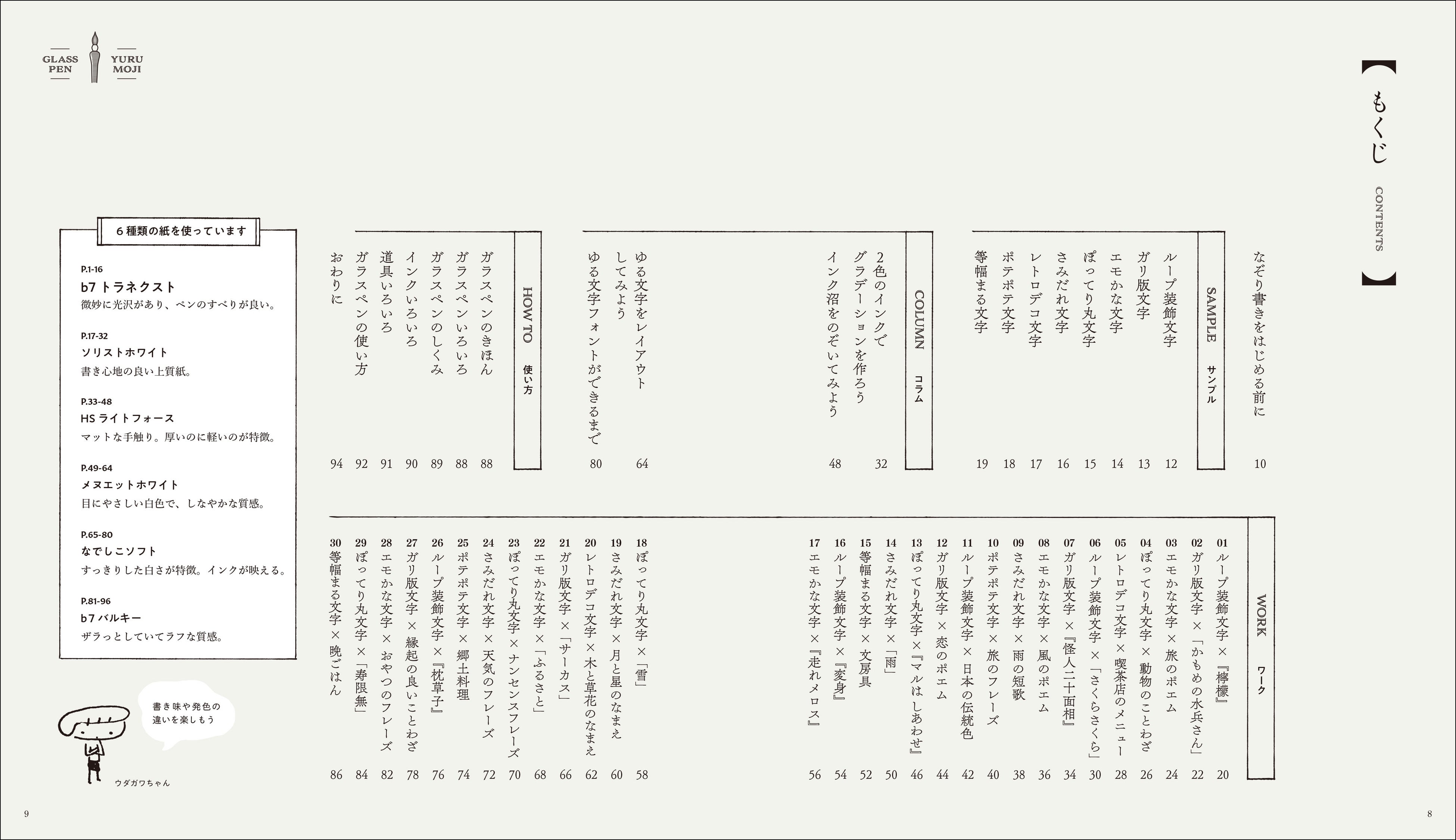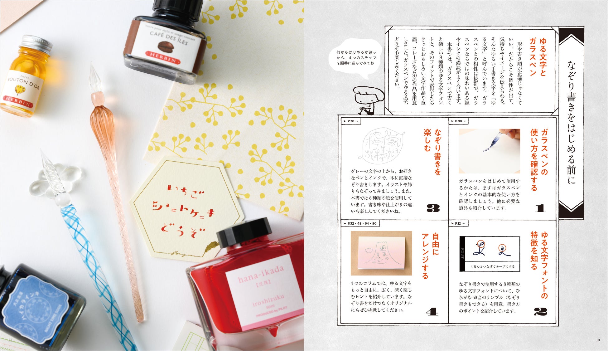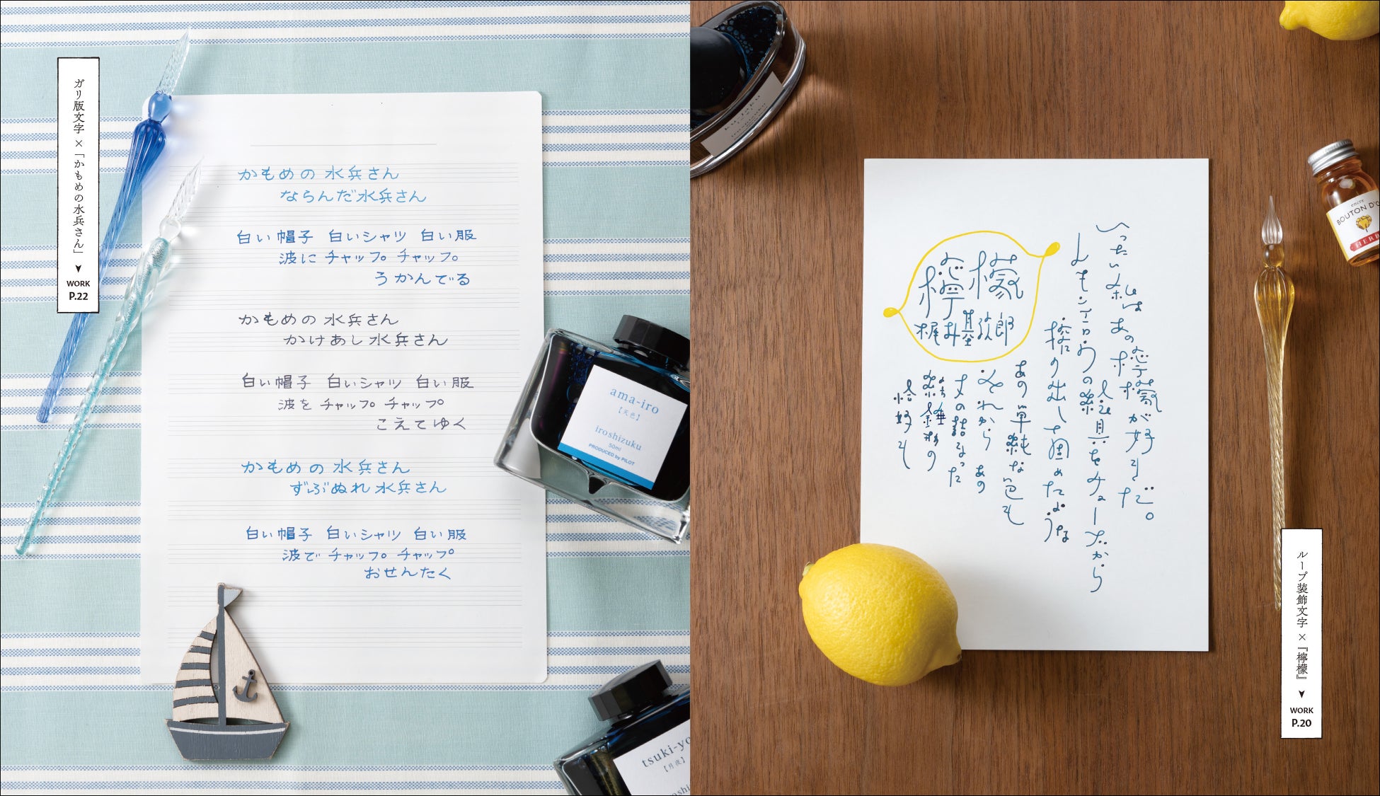 ガラスペンでなぞり書きするのは、名作文学や童謡、日常で使えるワードや書くのが楽しいオノマトペなど。