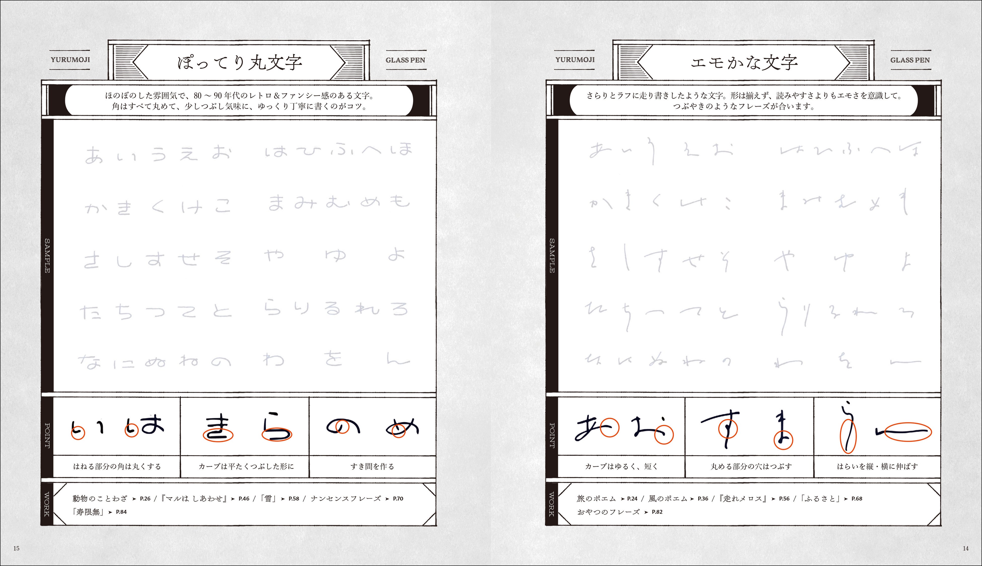 文章に添えるフレーム飾りやポイント飾り、かわいいイラストもガラスペンでなぞり書きできます。